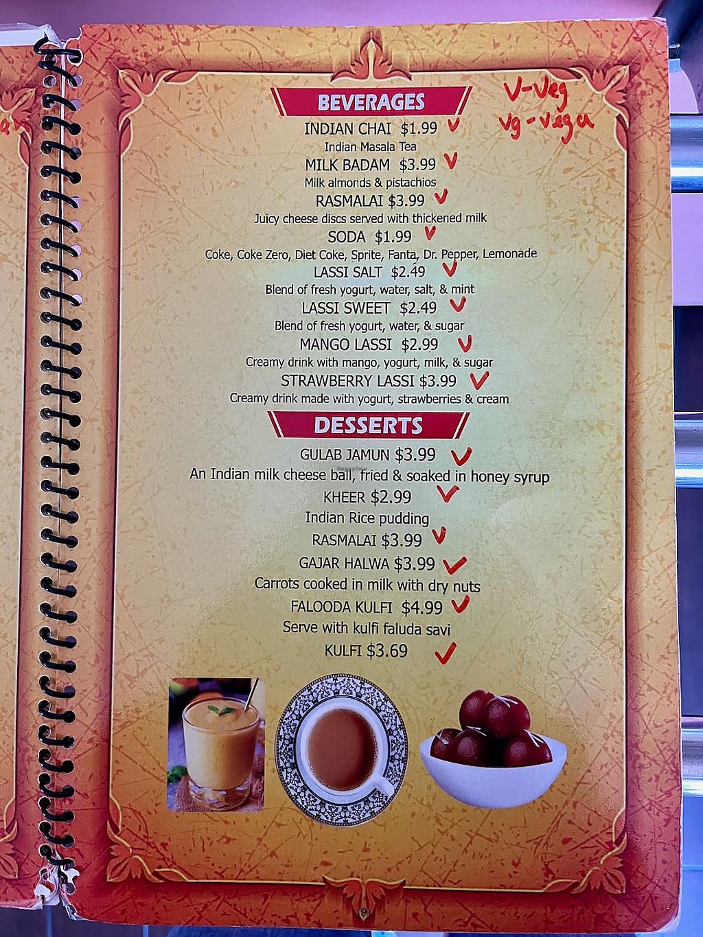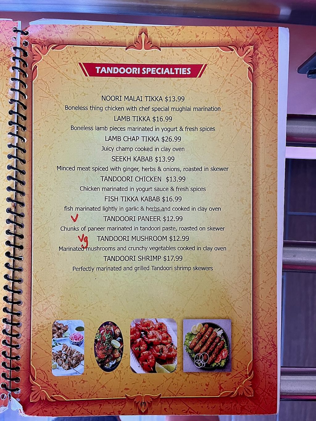Serves meat, vegan options available. Indian restaurant with vegan options, including eight vegan vegetable dishes, one vegan tandoori special, one vegan rice dish, and four vegan appetizers. Open Mon-Sun 11:00am-10:00pm.
