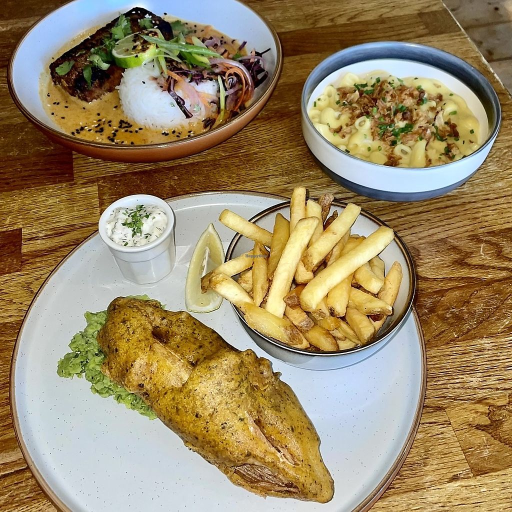 Amazing food, highly recommend. I had a few dishes, the Vish and chips, Mac and Cheese, The Wings of the Week, and then had their lemon cake and the millionaire shortbread. Excellent vibes and lovely staff!
