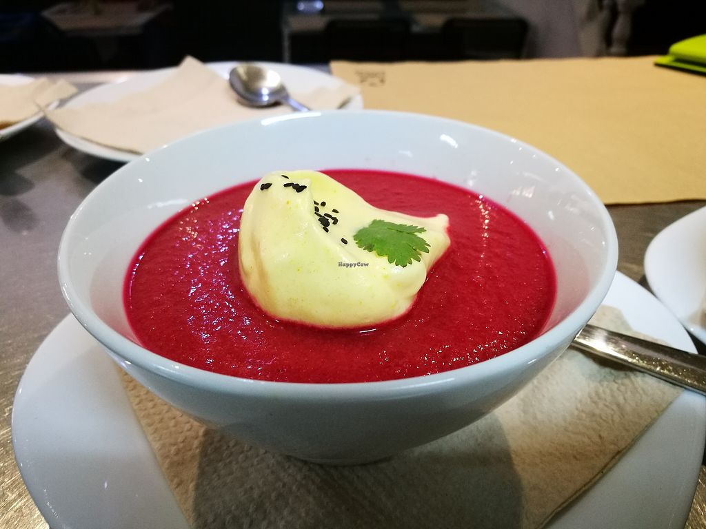 Beetroot gazpacho with mango foam.