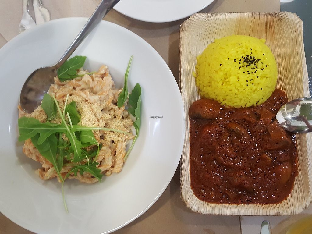 Left: Pasta and 'cheese'. Right: Boeuf Bourguignon with mushrooms.