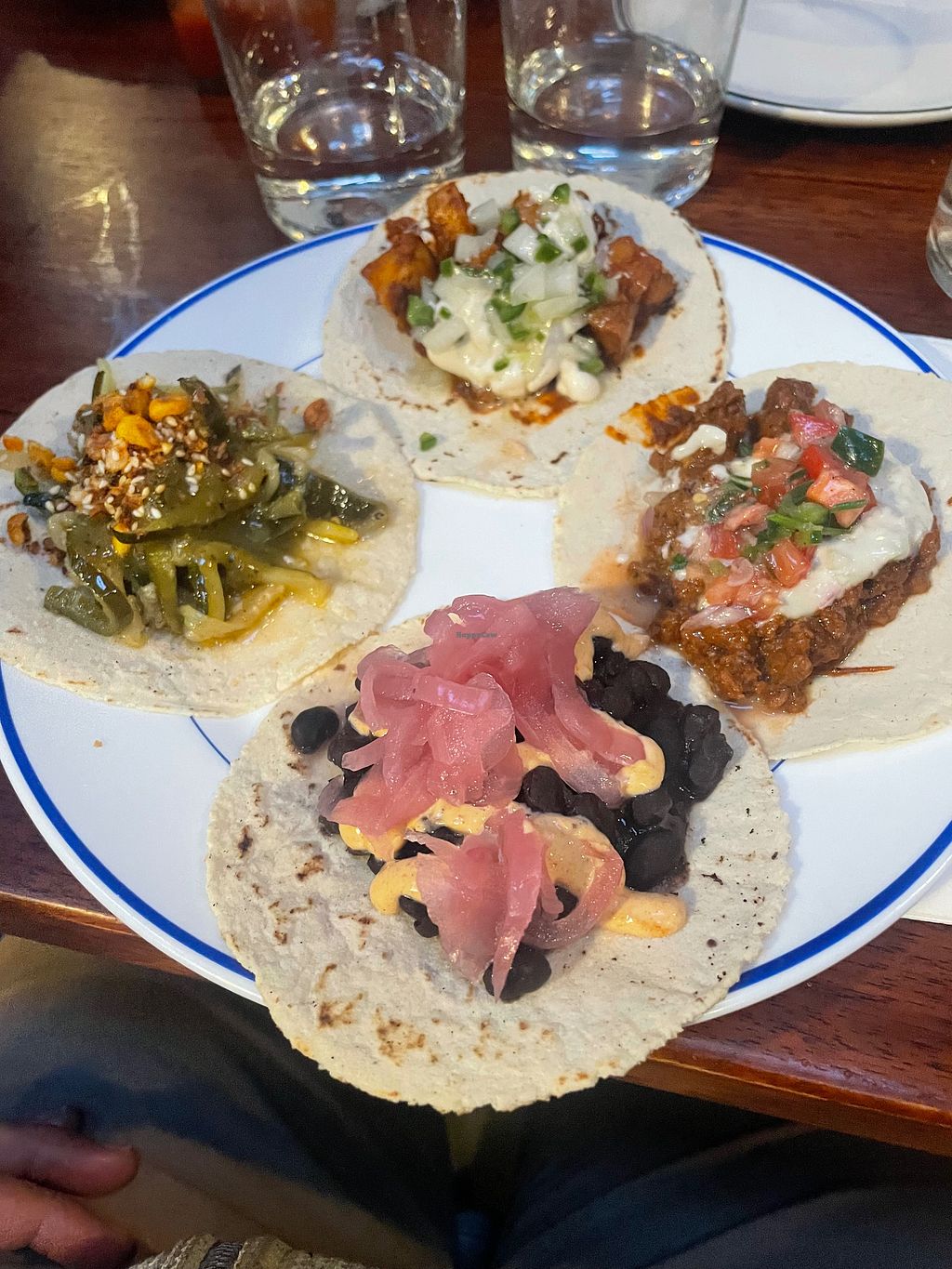 Read moreWe tried the seitan “pork” and pineapple taco (don’t knock it until you try it), a greens taco, a classic black bean taco and a plantain taco which I really enjoyed. We also had some guac and chips of course.