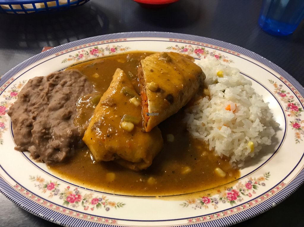 I trust Happy Cow reviews and this place sure didn't disappoint. There is a wide selection of vegan options marked in the menu. My husband got the bean and rice burrito and I got the chimichanga. Both were smothered in their famous green chili sauce. If I could bottle it up and take it home To another on everything, I would. The free chips and salsa was some of the best salsa I've ever had. Waitress was super friendly and the food was fresh and piping hot.