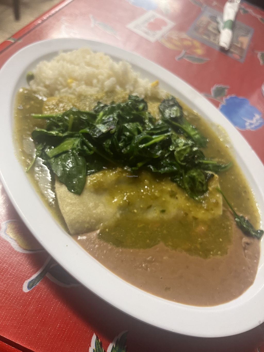 Read moreWe started with complimentary salsa and chips—fresh and flavorful. For our main dishes, we enjoyed the Budas Burritos, packed with rice, beans, mushrooms, cactus, potatoes, and carrots, all smothered in a tasty green chile. We also tried the Spinach Enchiladas in tomatillo sauce, perfectly complemented by a refreshing mango water.