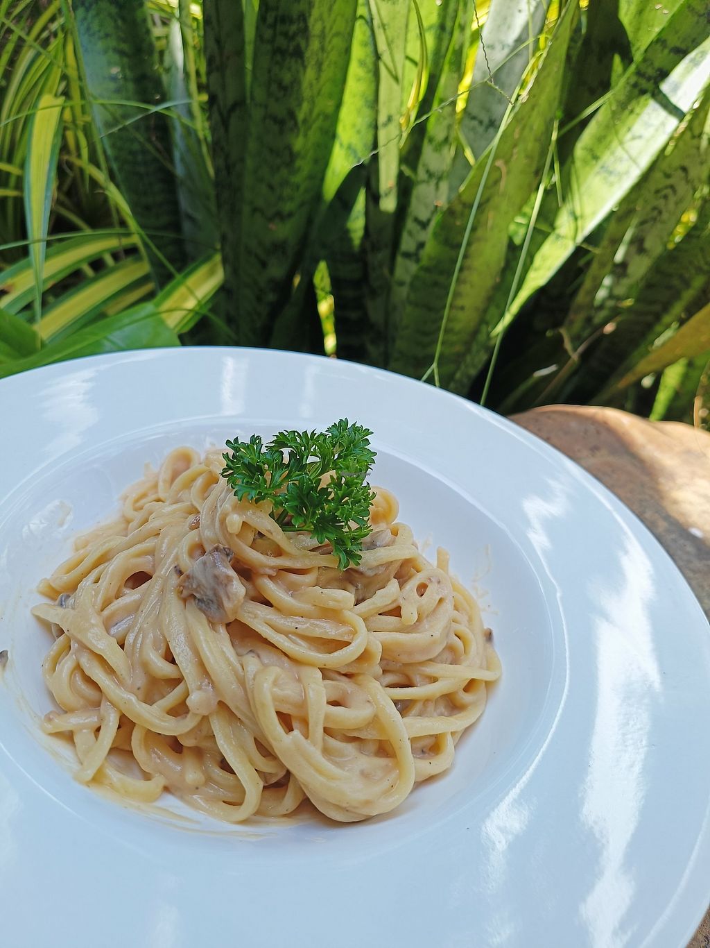Vegan-owned & operated (10 years experience cooking vegan food). Serves a vegan pasta with creamy mushroom sauce, a plant-based protein steak and other vegan items. Thai food made from tofu and mushrooms. (Please note does offer eggs & honey.) Address: 60 หมู่ 6 คลองศก พนม. Open Mon-Sun 8:00am-8:00pm.