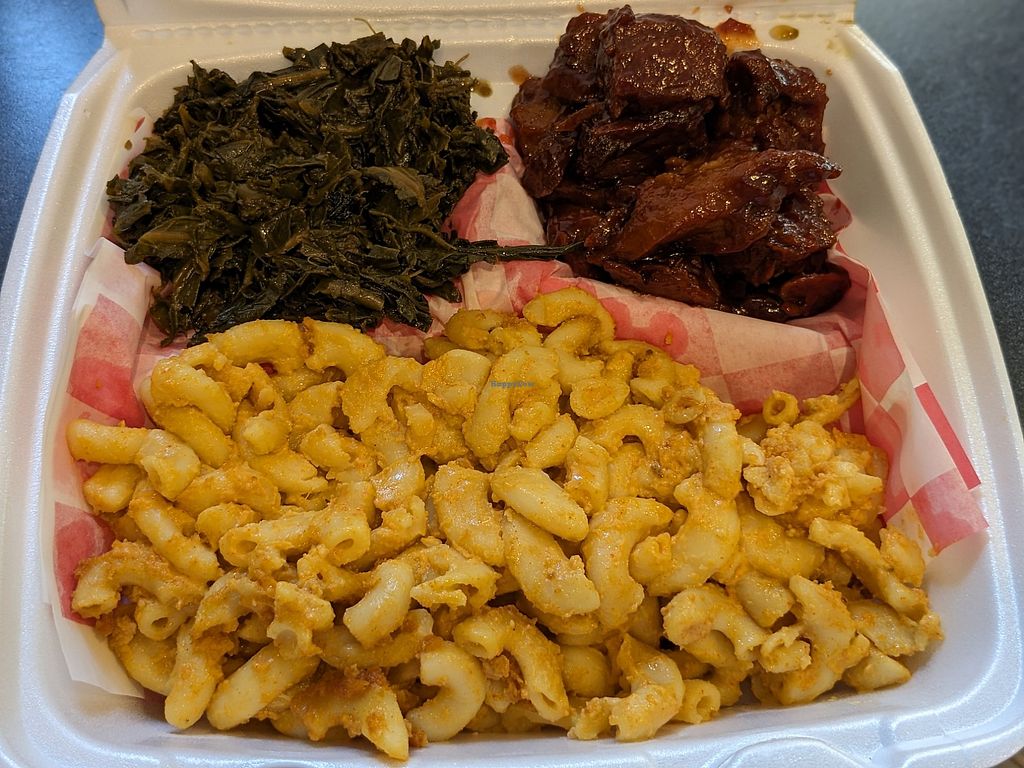 When I don't get the special, I get the barbecue plate. It comes with barbecue vegan chicken and two sides. I always get the mac and cheese. For the other side, I alternate. The collards are good. The sweet potatoes are very sweet, kind of like dessert. It's all good.
