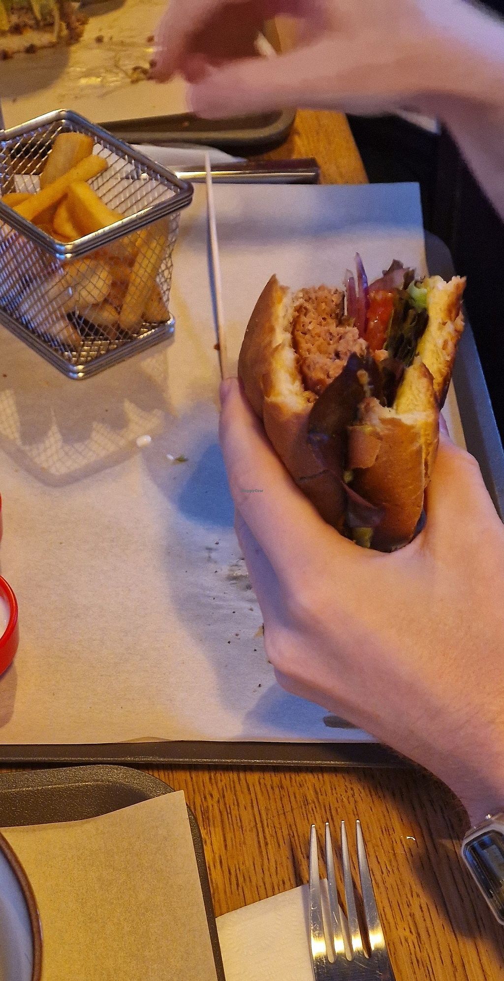 Lacto Ovo Fast food Beer/Wine European Honey Non-veg Serves meat, vegan options available. Burger restaurant offering a vegan falafel bowl and a vegan 'beef' burger. Open Mon-Thu 12:00-21:00, Fri-Sat 12:00-22:00, Sun 12:00-21:00. More
