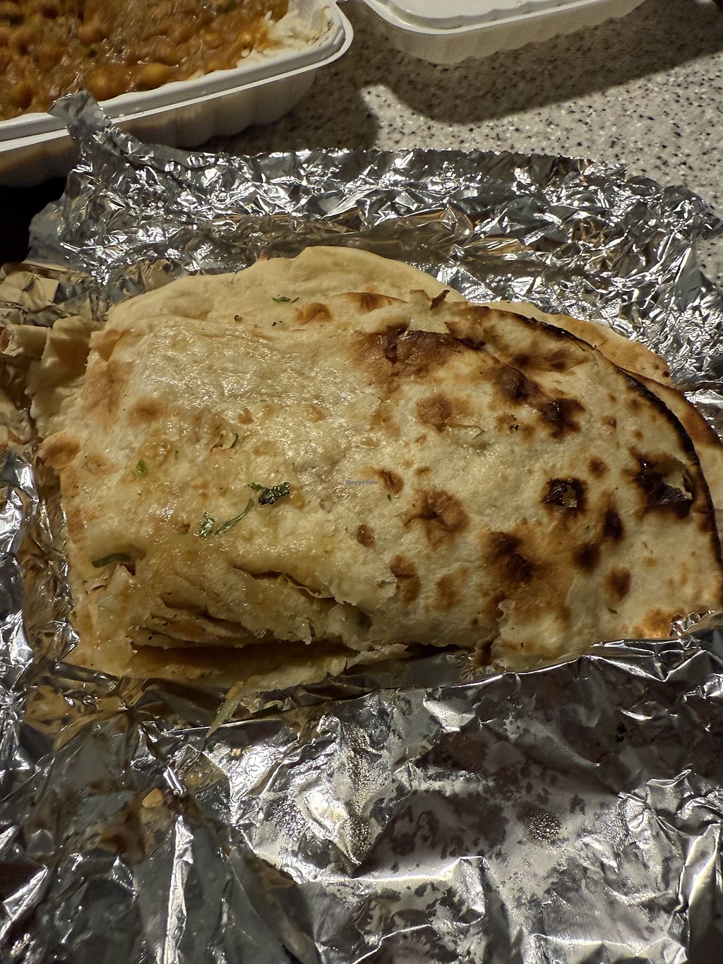 I sort of went all out for my first time, after reading reviews. So I’ll definitely have leftovers. I ordered garlic naan, vegetable pakora, vegetable wrap, and aloo mutter. All were fantastic. I chowed into the veggie wrap while driving home so that’s why it looks like that. They were very busy and I’m glad I called ahead of time because it’s a 24 minute drive and I still had to wait an extra ten minutes. So I recommend calling ahead and placing your order. When asked how spicy I wanted it, I said medium. It was perfect. Items are labeled vegetarian so I did verify first if they were vegan. The girl who took my order assumed that meant GF so she said what has wheat so I had to clarify.