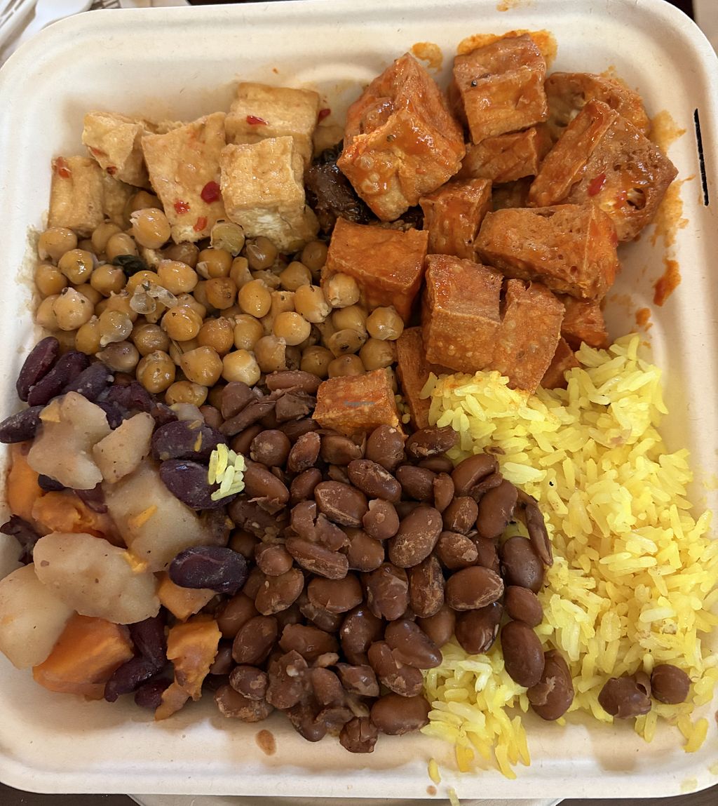 Delicious hot buffet choices. I had the jasmine rice with sweet chili tofu and curry cauliflower. All very tasty. Generous portions. Quick take-out. Reasonably priced. All good!