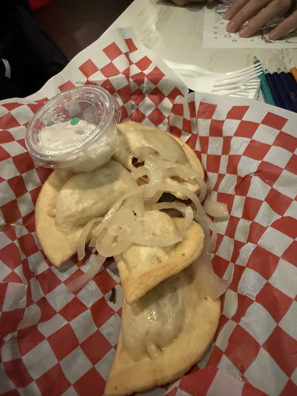 I had the potato and onion vegan pierogi with fried onions with vegan sour cream.