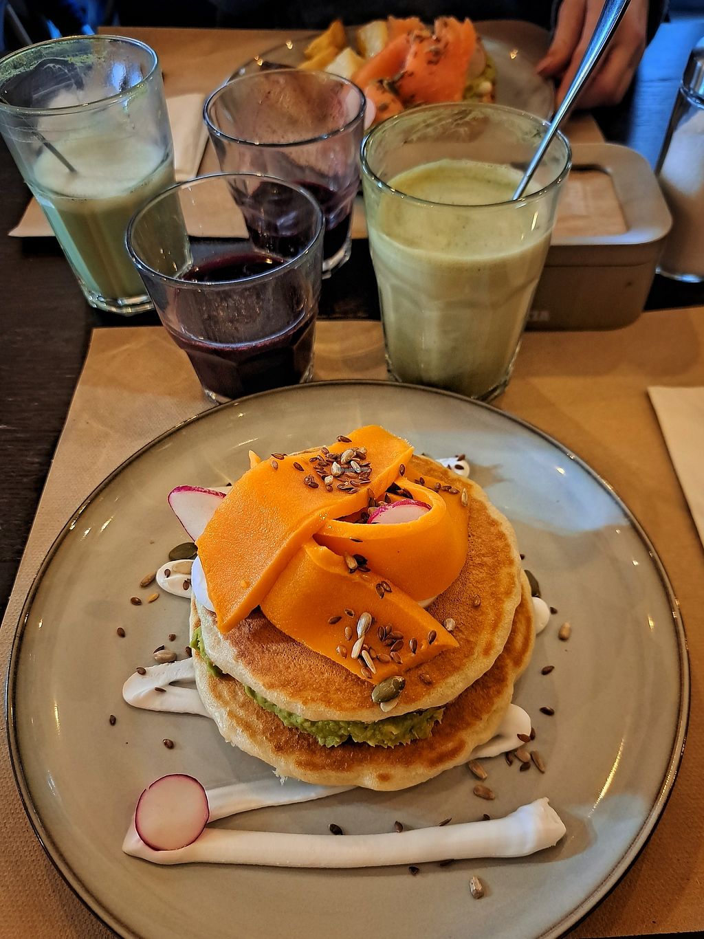 Super easy going through the menu as practically all items can be turned vegan. I had the savory vegan pancakes with "bacon", pancakes, some avocado crema and scrambled tofu. Everything was delicious.