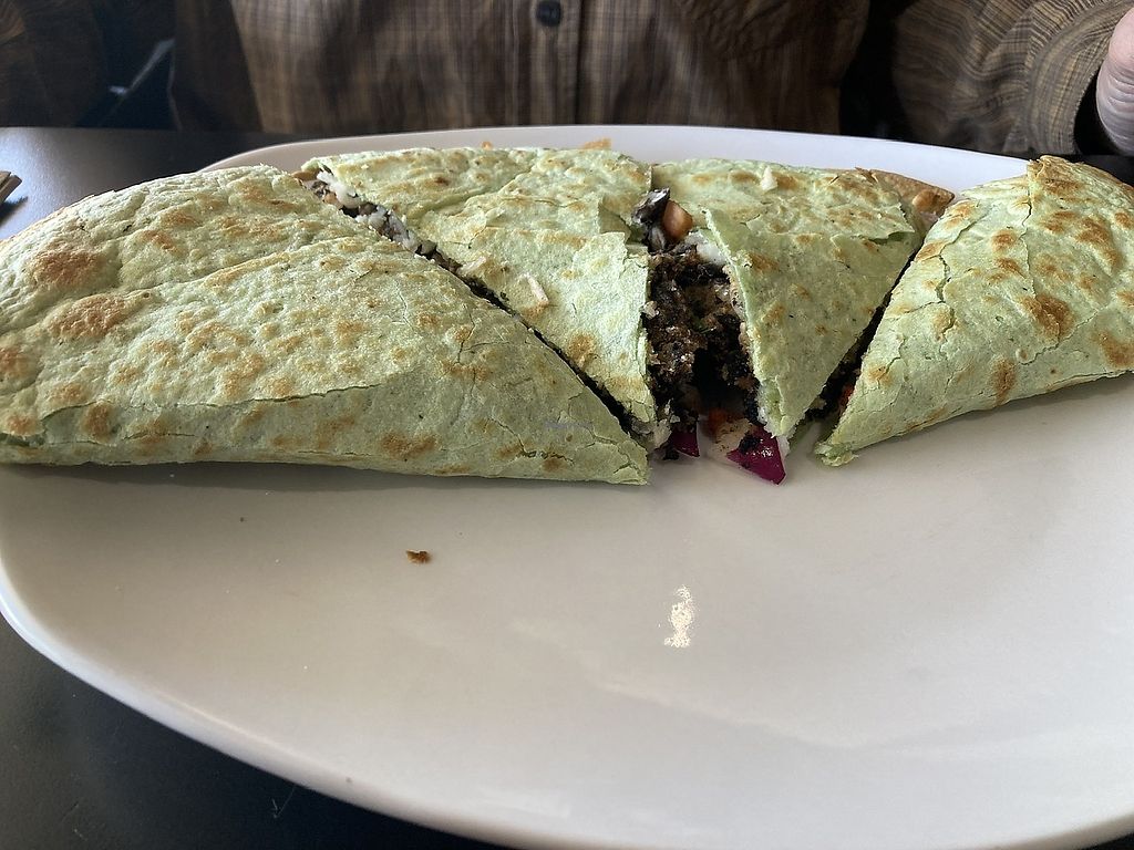 Quesadilla with vegan cheese substitute and veggie burger added as pro…
