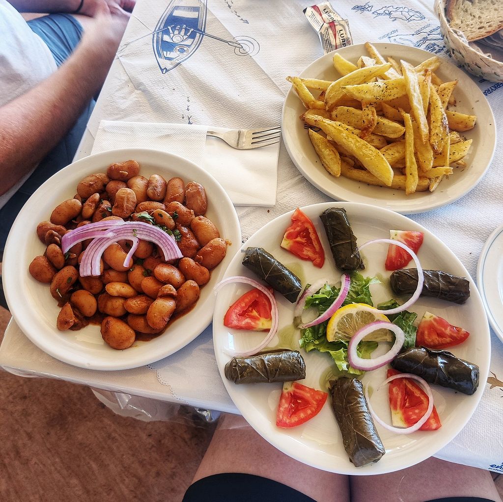 Serves meat, vegan options available. Traditional Greek restaurant on the beach. Several vegan options on the menu., Gigantes, Dolmades, Fries, Bread Listed as open 24 hours online, however I'm not sure that's true.