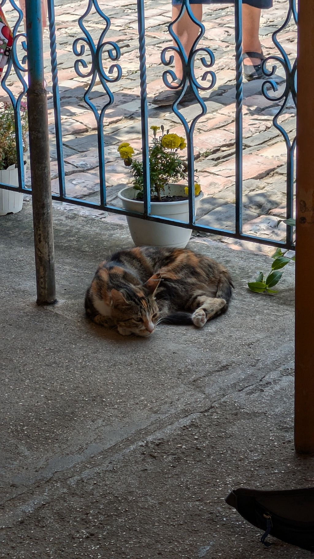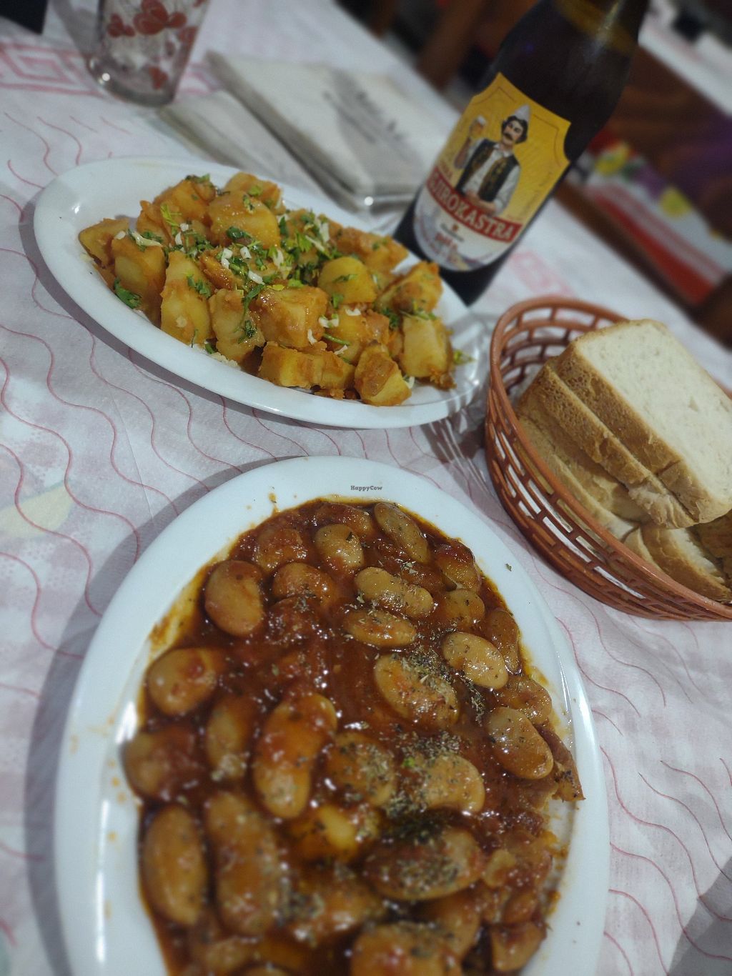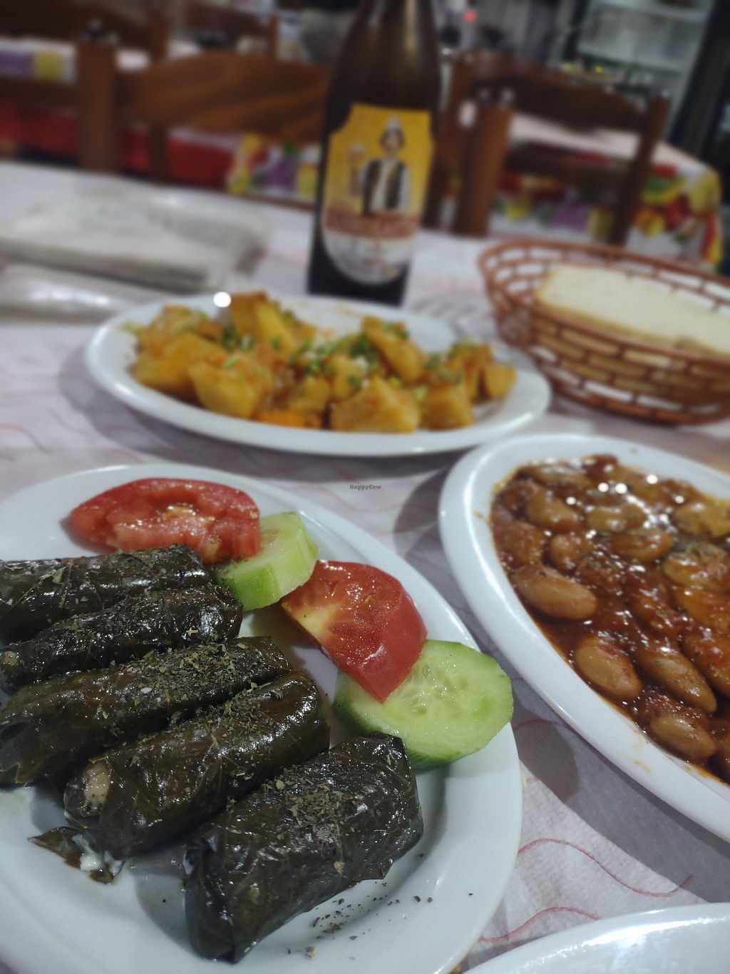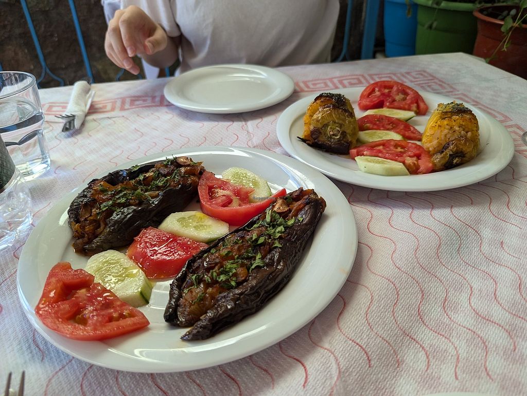 We walked past this restaurant on our way to see the ancient aqueduct (highly recommend this) and the owner, seeing we were low on water, kindly offered to fill up our bottle. We casually inquired about the food and he told us most of what was on the menu was actually vegetarian, such as the moussaka and two dishes traditional to this town: a corn and spinach pie and fried 'qifqi' rice balls (like arancini) as well as some vegan options. So we returned from our short hike and ordered the vegan bean stew, stuffed eggplant, and sarma (rice stuffed vine leaves). Roasted potatoes and vegetables, fries and salads were also available on the menu. The generous owner gave us pickled vegetables to go with his homemade raki (one of the best grape rakis I've ever had) and we had a unique and delicious clove liqueur with a fruit platter for dessert.