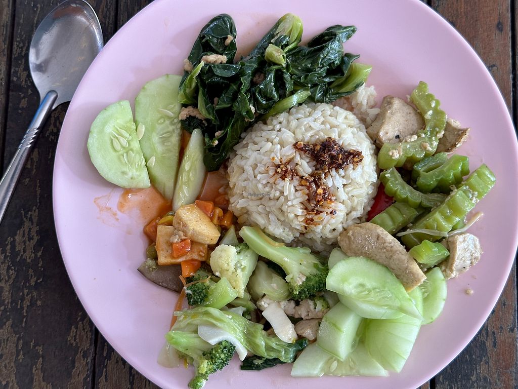 Rice with five things from the buffet (and a bottle of water), 120 bah…