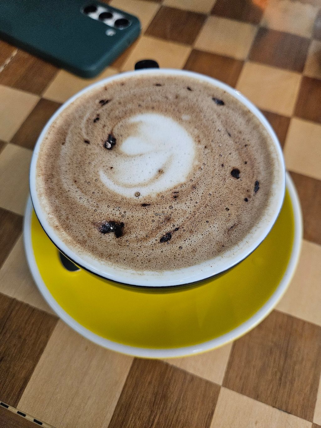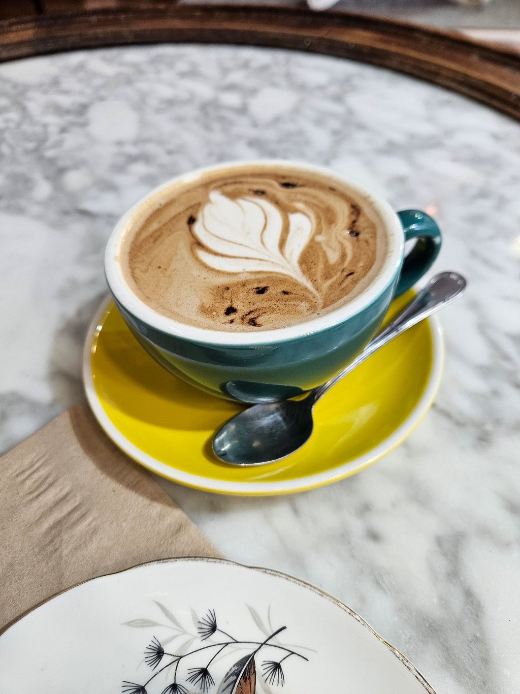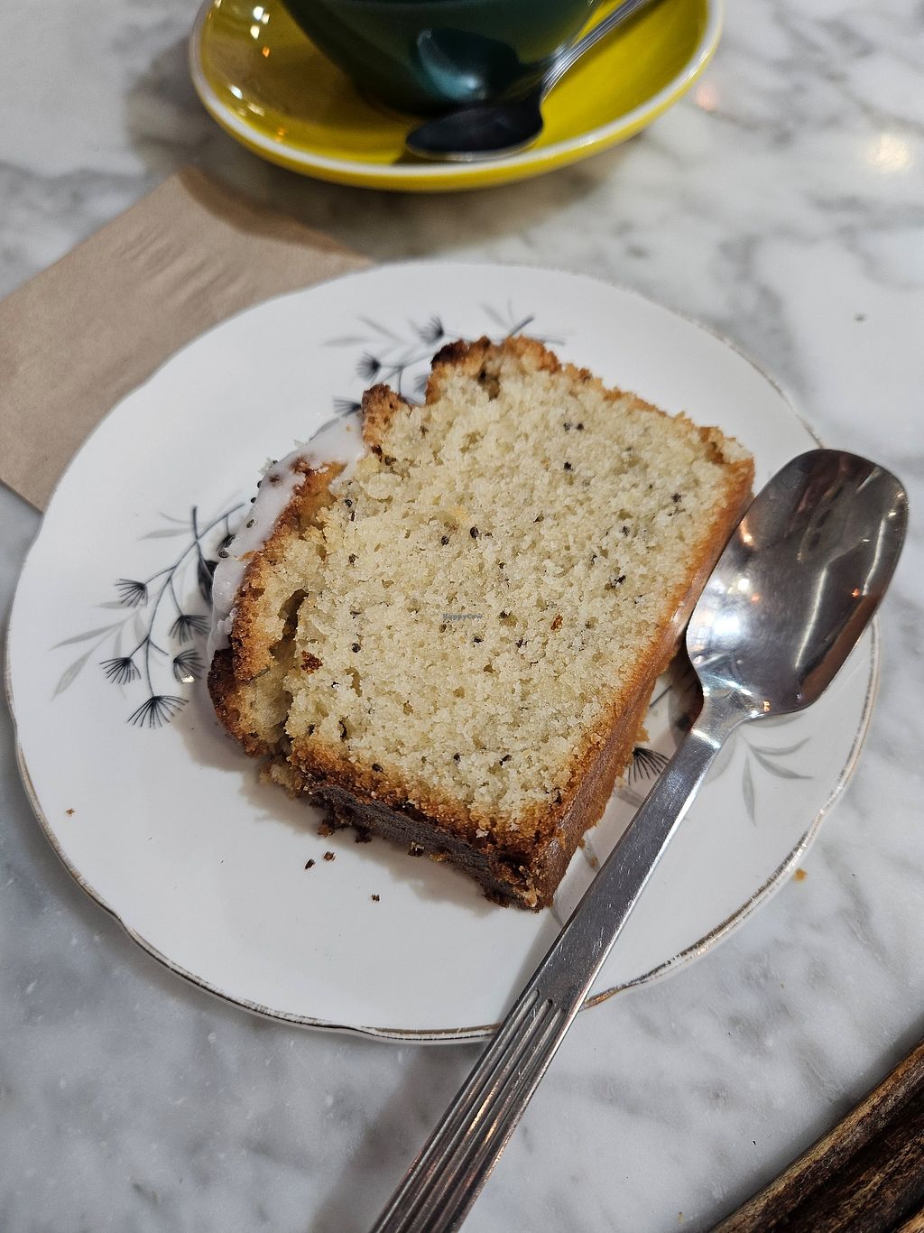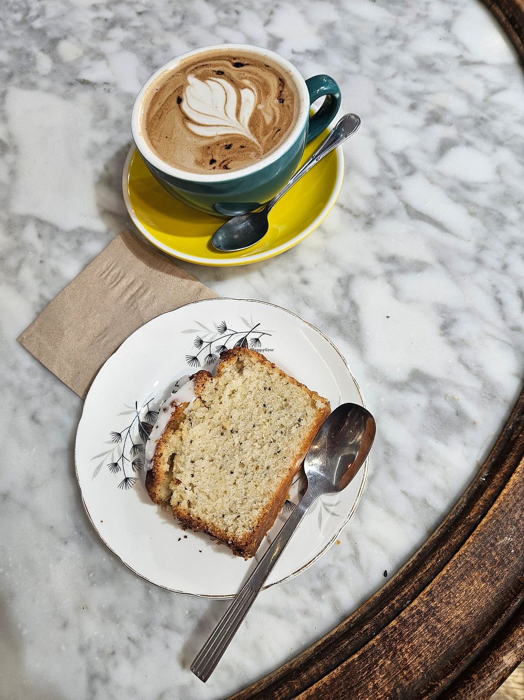 Kuchen mit Blutorange und Iced Latte mit Sojamilch. Köstlich!