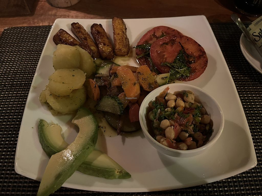 Serves meat, vegan options available. Restaurant offering vegan mashed potatoes with vegetables, roasted tomatoes, avocado and baked banana. Open Mon-Sat 6:00pm-9:00pm.