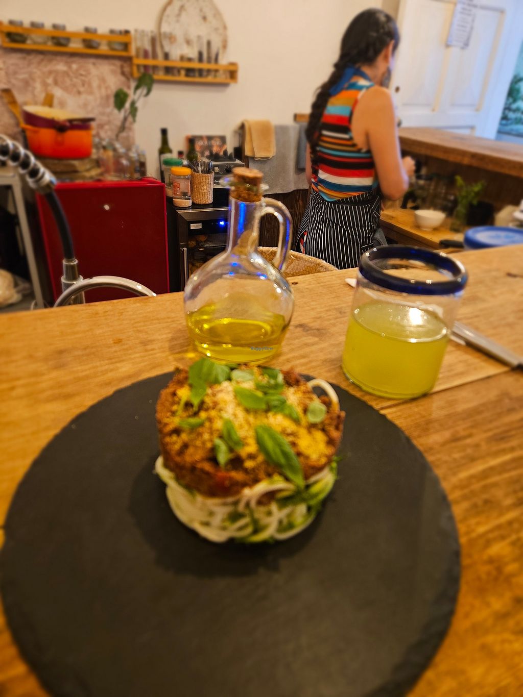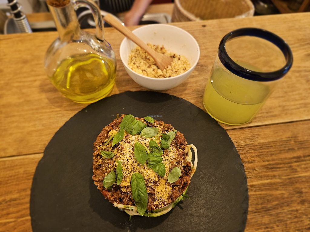 Lasagna and a cucumber/lime drink