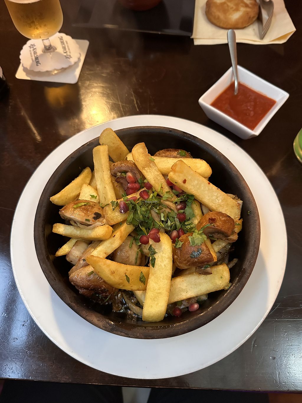 Nice seating inside, reservation recommended as it gets quite busy. Service was functional but not overly friendly, and slow - we waited 60 minutes for our food. We had the starter platter for one, the lobiani stuffed with kidney beans, the farmer's salad with vinaigrette, and the mushroom and potato dish. The lobiani was nice and the salad was refreshing with a tangy dressing and fresh herbs including coriander, but the main dish was disappointingly bland with mealy potatoes and no seasoning or sauce to speak of except a small cup of plain tomato sauce that arrived separately. Not worth the price. The bright green Georgian tarragon lemonade was very sweet but fun.