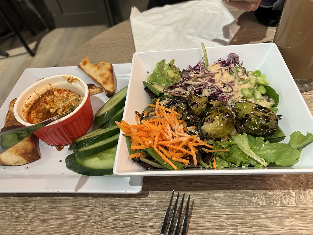 Ordered the fresh made hummus with chili/ginger topping. Comes with fresh baked pita bread and sliced cucumbers. We share a bowl of spring greens, grated carrots, edamame, avocado, and grilled veggies with wasabi ginger dressing. Do good! A cup of chai for him, cup of matcha for me. Warmed us up!