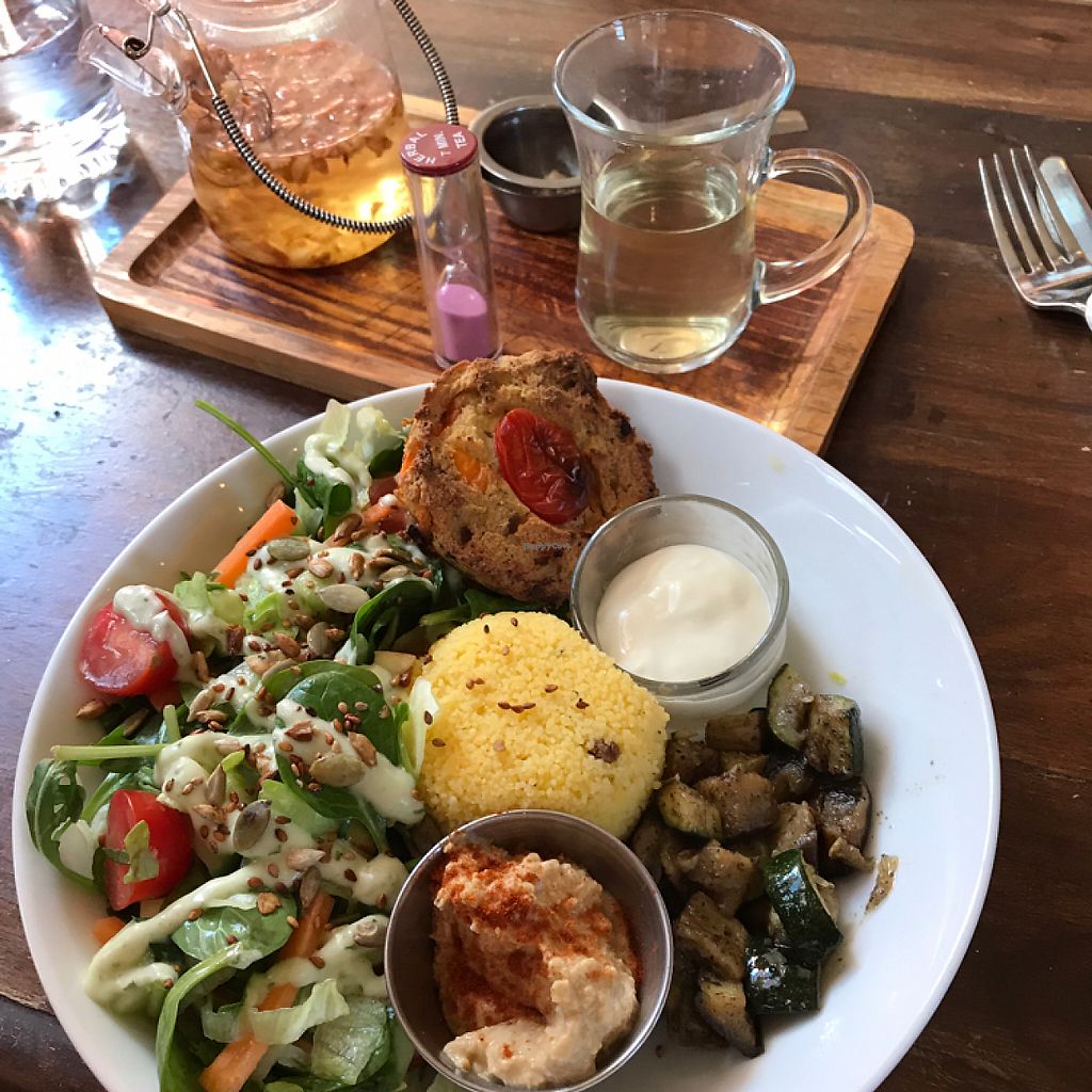 a mixture of roasted veg, couscous, home made mayo and homemade hummus, falafel and salad. presented well and tasted better.