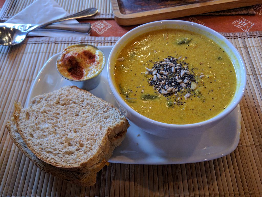 Tea Sutra has quite a hippie vibe, with Asian tea house and middle-eastern décor. There is even an area where you sit on cushions (have to take off your shoes). It provides a calm and warm atmosphere. The place is quite spacious too. The service was a bit slow (my soup took quite a while to come even though it wasn’t busy), but the staff are friendly and helpful – the waiter was very patient in answering our questions about the different teas they offer. Oh yes, they have a WIDE tea selection of various types and country origins. Evidently, they are very passionate about their tea, so they do take a while to get your tea ready. We were given hourglasses when tea was served for optimal tea steeping times. So, it is probably not a place to go if you’re in a hurry (unless you just want to grab one of their divine vegan cakes!).