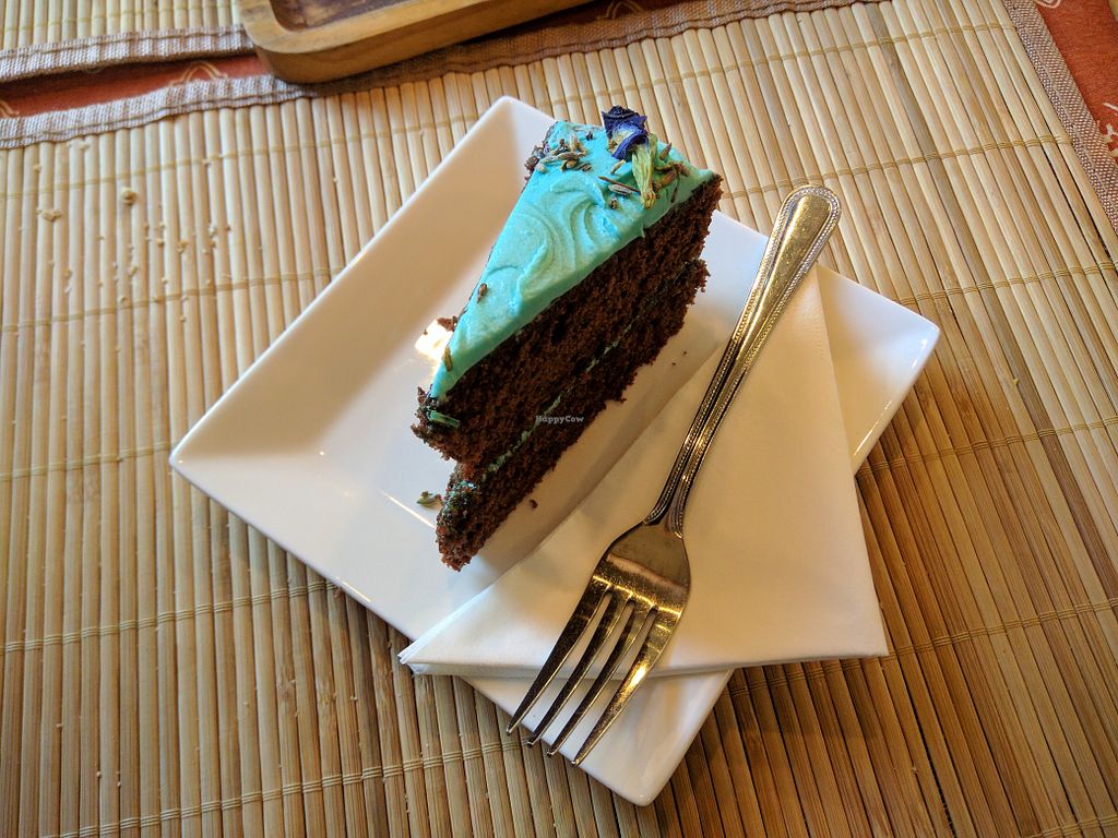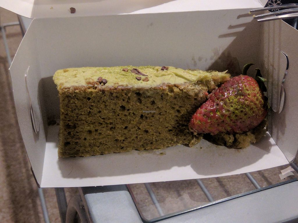 We each ordered a pot of tea, and I had the Soup of the day (Lentil, carrot and spinach) that was served with bread and hummus. The soup really hit the spot! It was hearty, thick and well-seasoned with some spices too! The homemade hummus was delicious as well. It made for a very satisfying meal that was cheap for what you get! Of course, I couldn’t resist getting trying the Vegan Cakes. I had the Chocolate & Blue Peaflower Cake and takeaway a Matcha, green tea & strawberry cake. Both cakes were divine, definitely one of the best vegan cakes I’ve had – great spongey and moist cake texture (that was similar to any non-Vegan cake, not dense or too moist like most vegan cakes). The Chocolate and Blue Peaflower cake was chocolatey with some freshness and fragrance from the peaflower in the frosting. I absolutely loved the matcha, green tea & strawberry cake – they weren’t afraid: very bold matcha green tea flavour that was complimented by the juiciness and tartness of the strawberry.