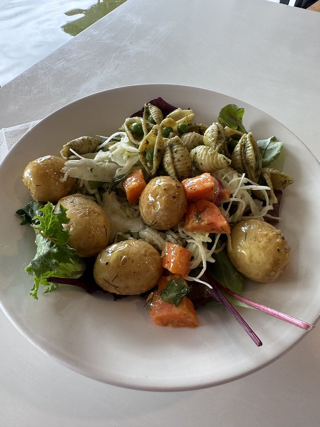 We got tofu wraps with salad and mango dressing, potato salad, vegan pesto pasta, a really good kohl rabi salad, freshly pressed apple juice and coffee. All was pretty good, the salads and apple juice were the best.