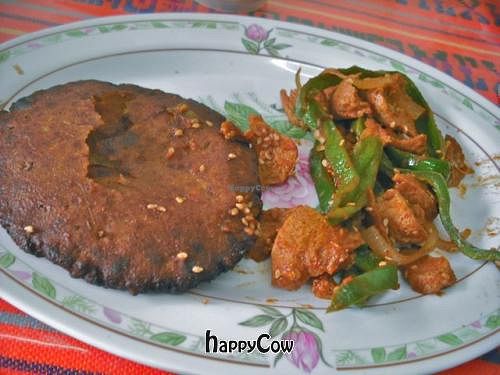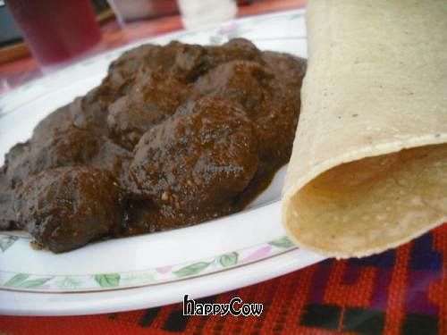 Soymeat with rich mole sauce and fresh corn tortillas