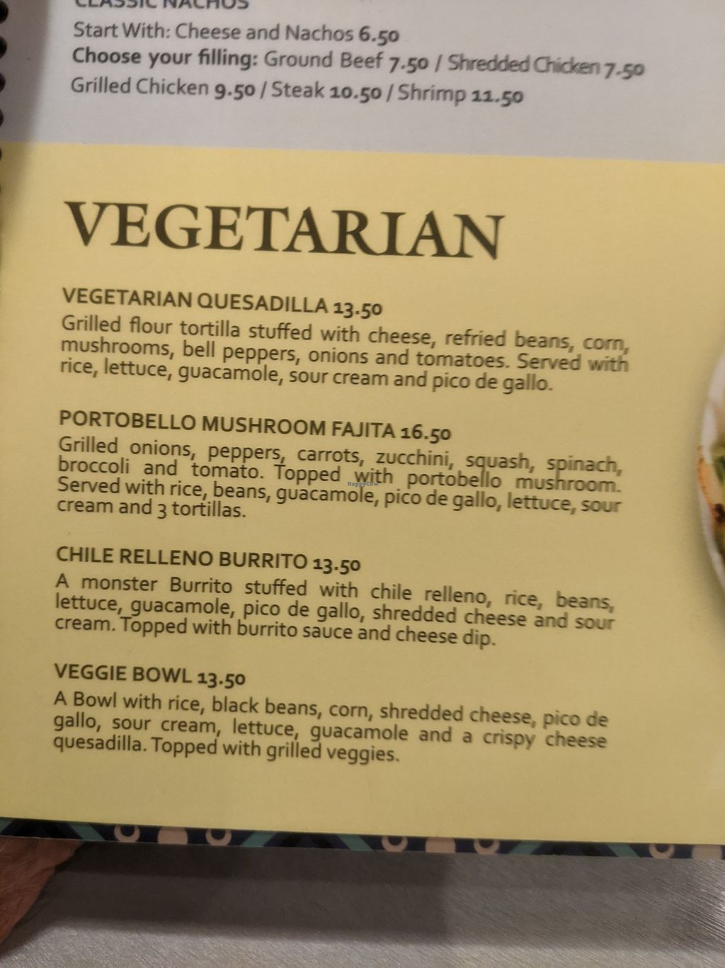 Serves meat, vegan options available. Mexican restaurant with vegetarian dishes that can be made vegan upon request. Vegetarian menu section is clearly labeled and may include taco salad, vegetable rice bowl, vegetable fajitas, chips with guacamole and burrito. Specify no dairy when ordering. Open Mon-Sat 11:00am-10:00pm, Sun 11:00am-9:00pm.