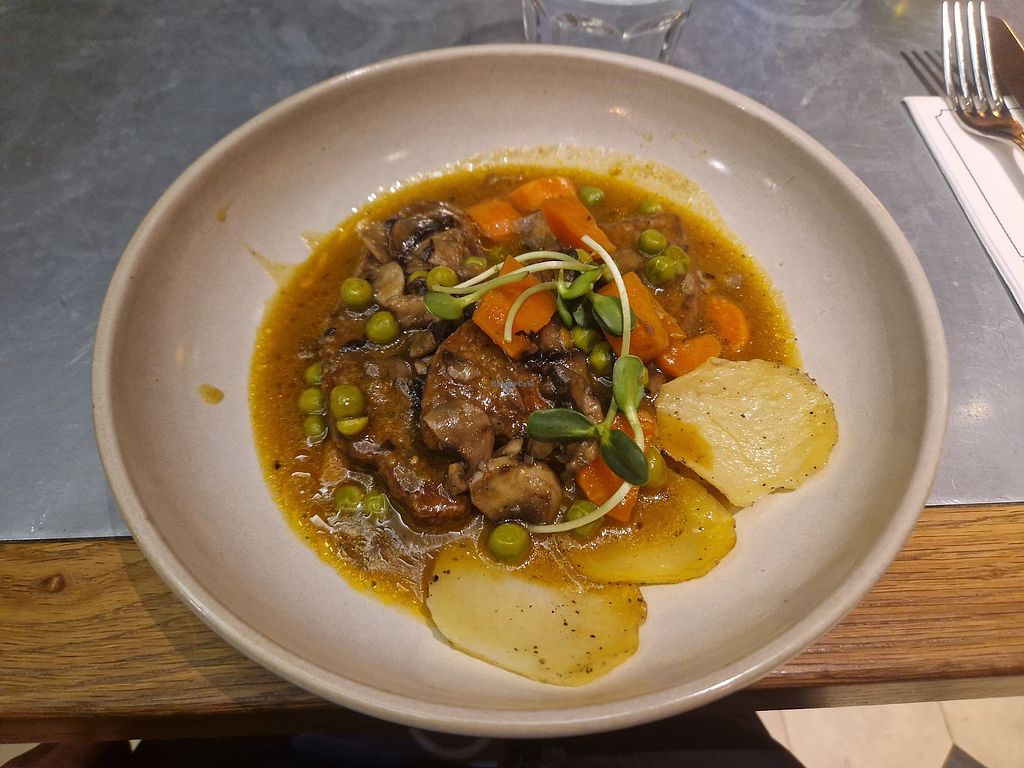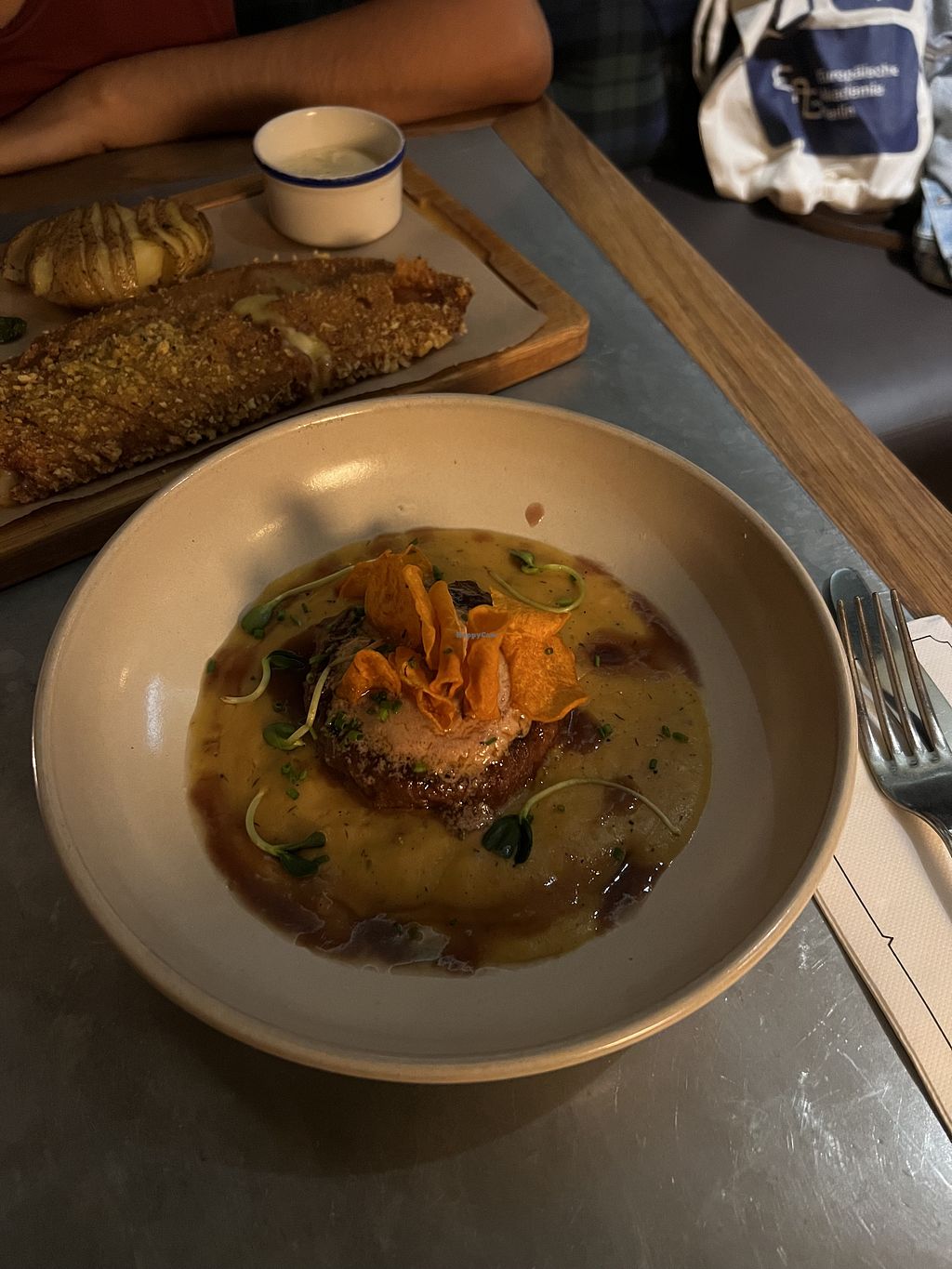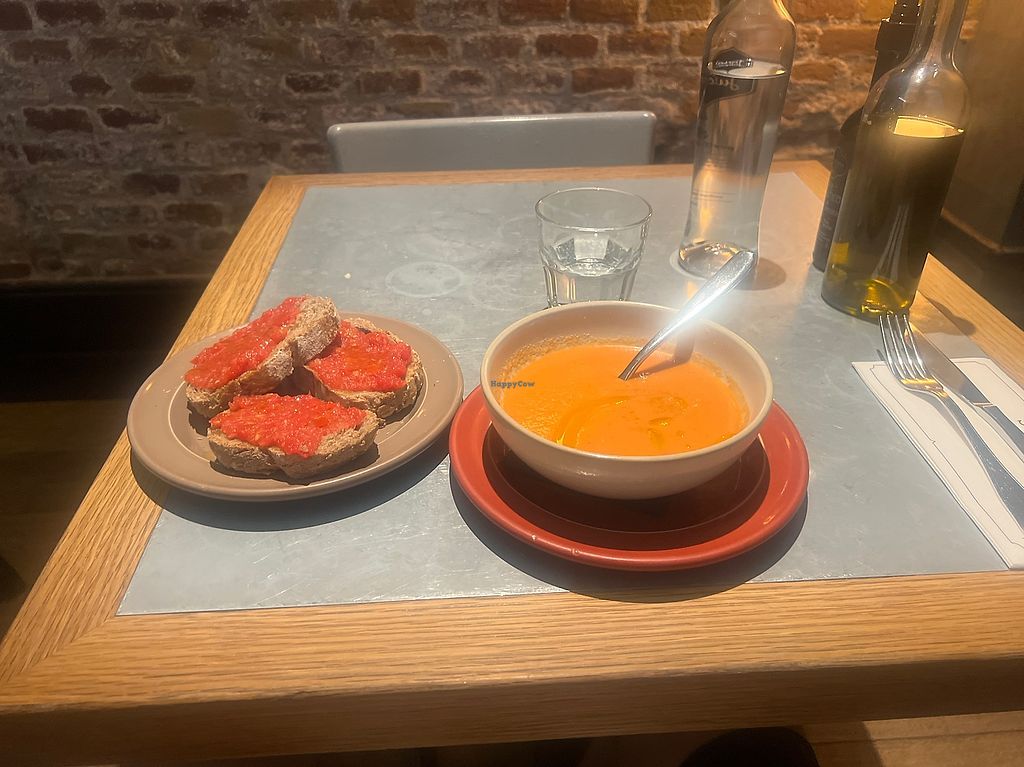 The place is huge, and packed with people during lunchtime. Luckily, we got a table. Service was slightly hurried, resulting in a bit of impoliteness, but the food itself was there quickly and tasted good. Vegan food is clearly marked on the menu, and there is even a selection! I had the gold gazpacho and mushroom risotto, which were both innovative and tasty. Portions could have been bigger, but for that price, not a big deal.
