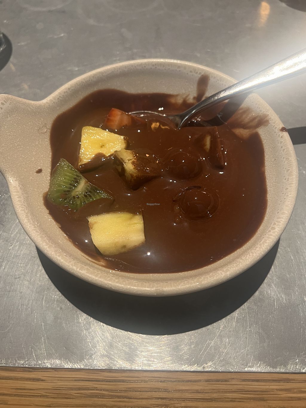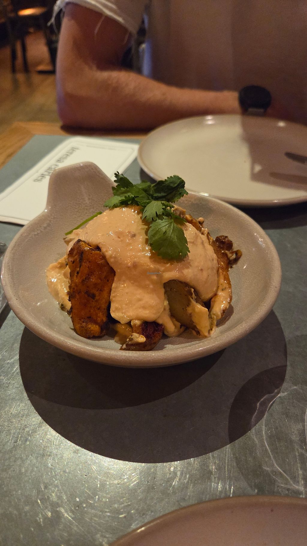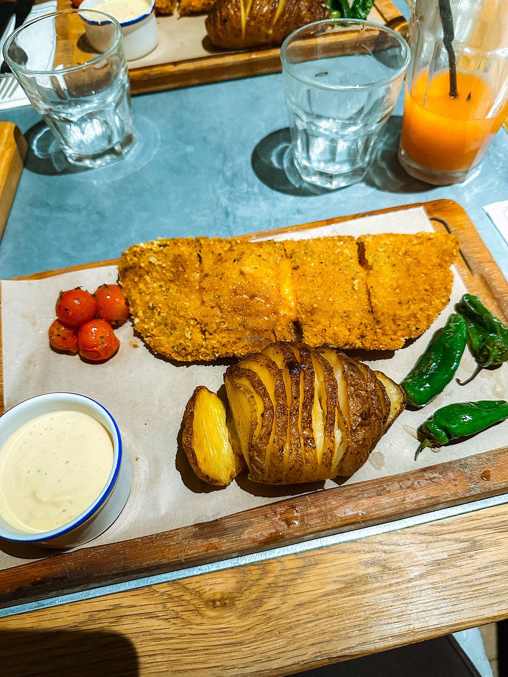 Lo más decepcionante fué el cachopo vegano relleno. El cachopo no estaba jugoso y de sabor "meh"!. Las patatas que lo acompañaban estaban muy secas y las salsas que pusieron de estilo hindú no pegaban para nada con el tipo de comida.