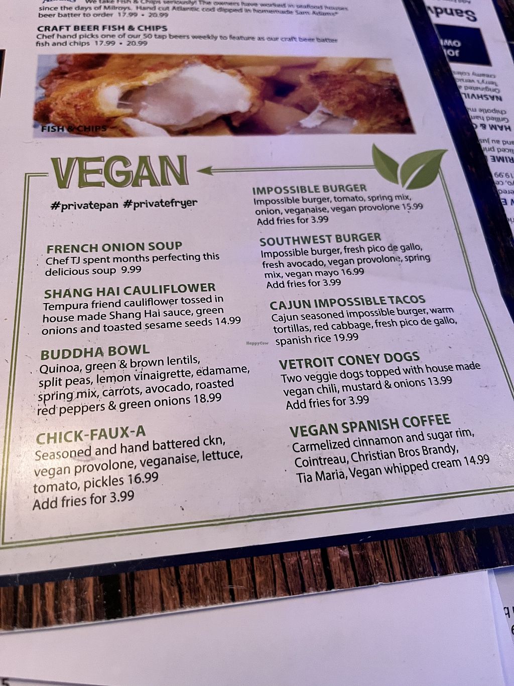 Since it’s not listed anywhere online that I’ve been able to find, I was skeptical about their separate vegan/vegetarian menu. I was so wrong. They have several options that are so good! They have the impossible burger which is delicious and a great beer menu as well.