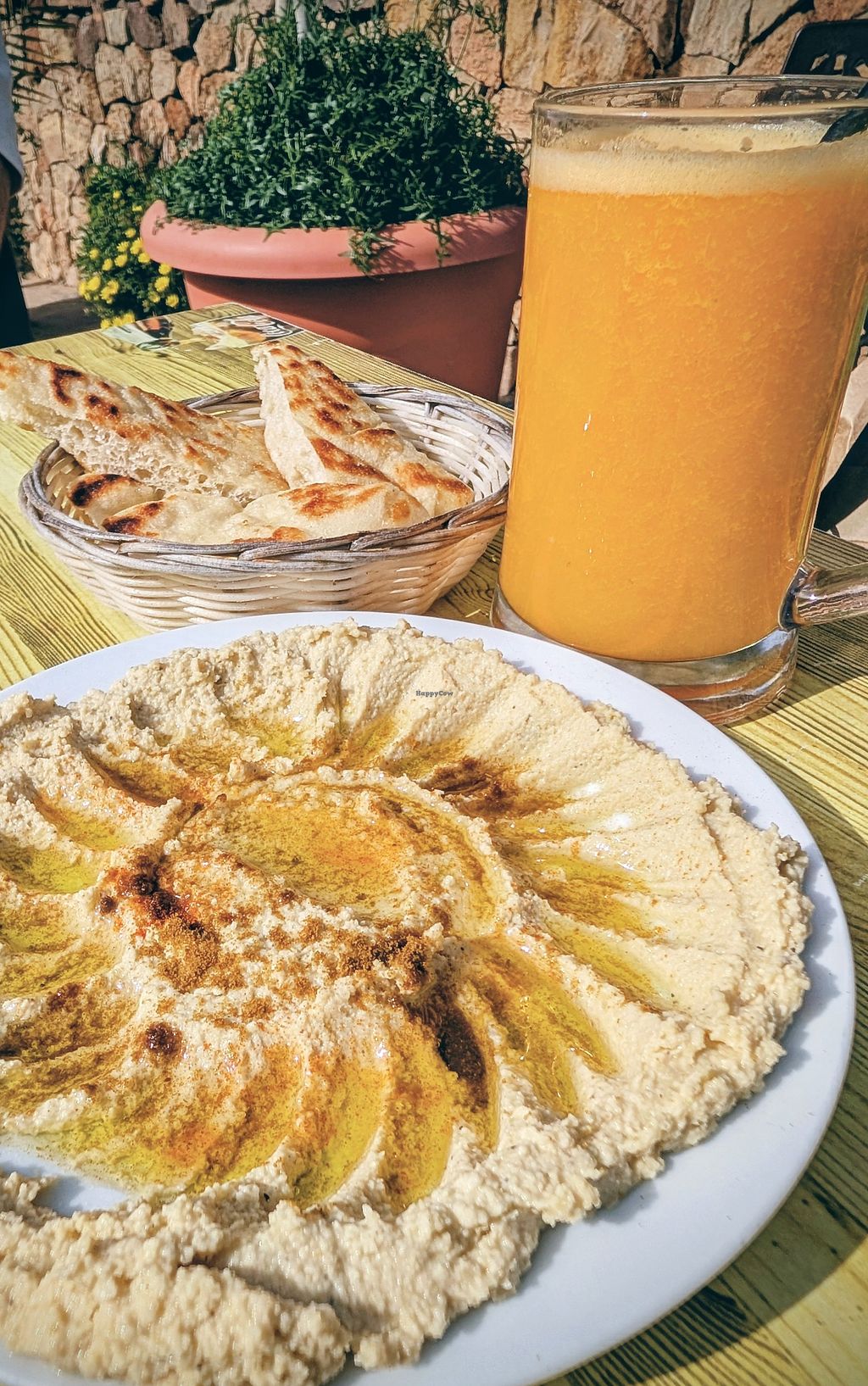 Felafel, Hummus, Ajo Blanco Saranjo, Fresh carrot and Orange juice