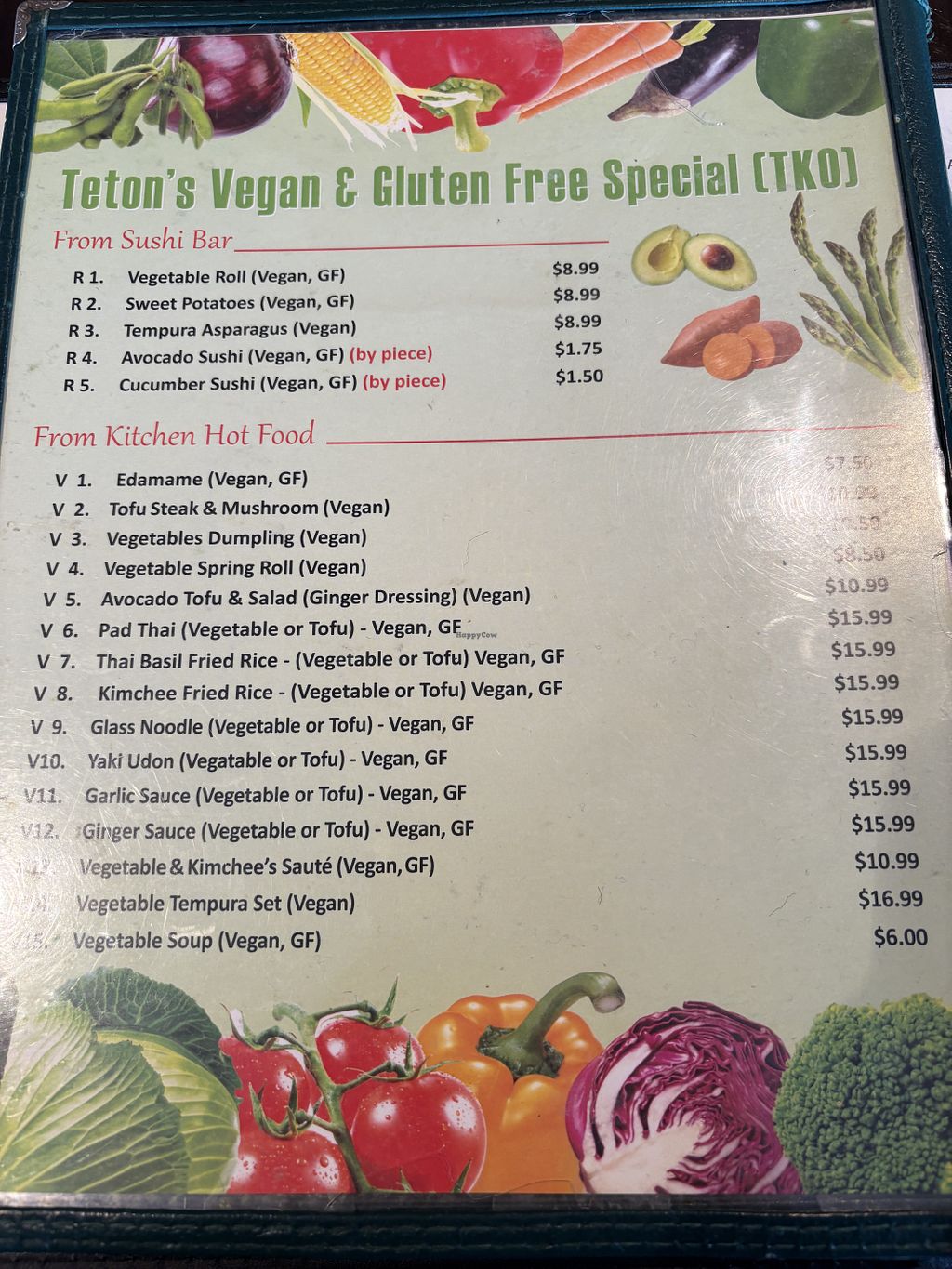Nice pan Asian restaurant. Has separate Vegan menu with lots of options: sushi, fried rolls, spring rolls, pad thai, noodles, kimchi, and tempura. Food was good! I was able to order ahead of time on website easily. Staff are friendly and efficient.