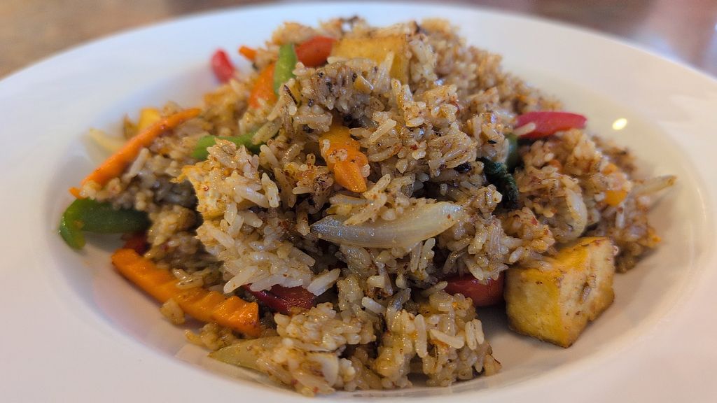 2025-02-14 Review: Many of the items can be made vegan on request. I was told that I need only ask. I decided on Mango Fried Rice. The waitstaff asked many questions about what I would like in my Mango Fried Rice and how spicy I wanted it. They ask on a 1-5 scale and I requested a 4/5. The rice was quite delicious with a good wok hei (smoky flavor imparted from a skilled chef using a wok) which added a lot of depth even if the rice was ever so slightly dry. Given how flexible and friendly the staff are, I would definitely eat here again. In fact, I will probably come back in the next few days.