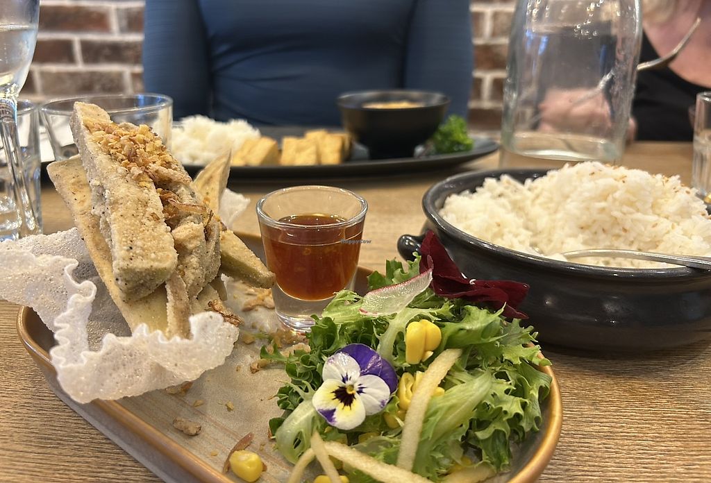 Coconut crusted tofu and money bags for entree.