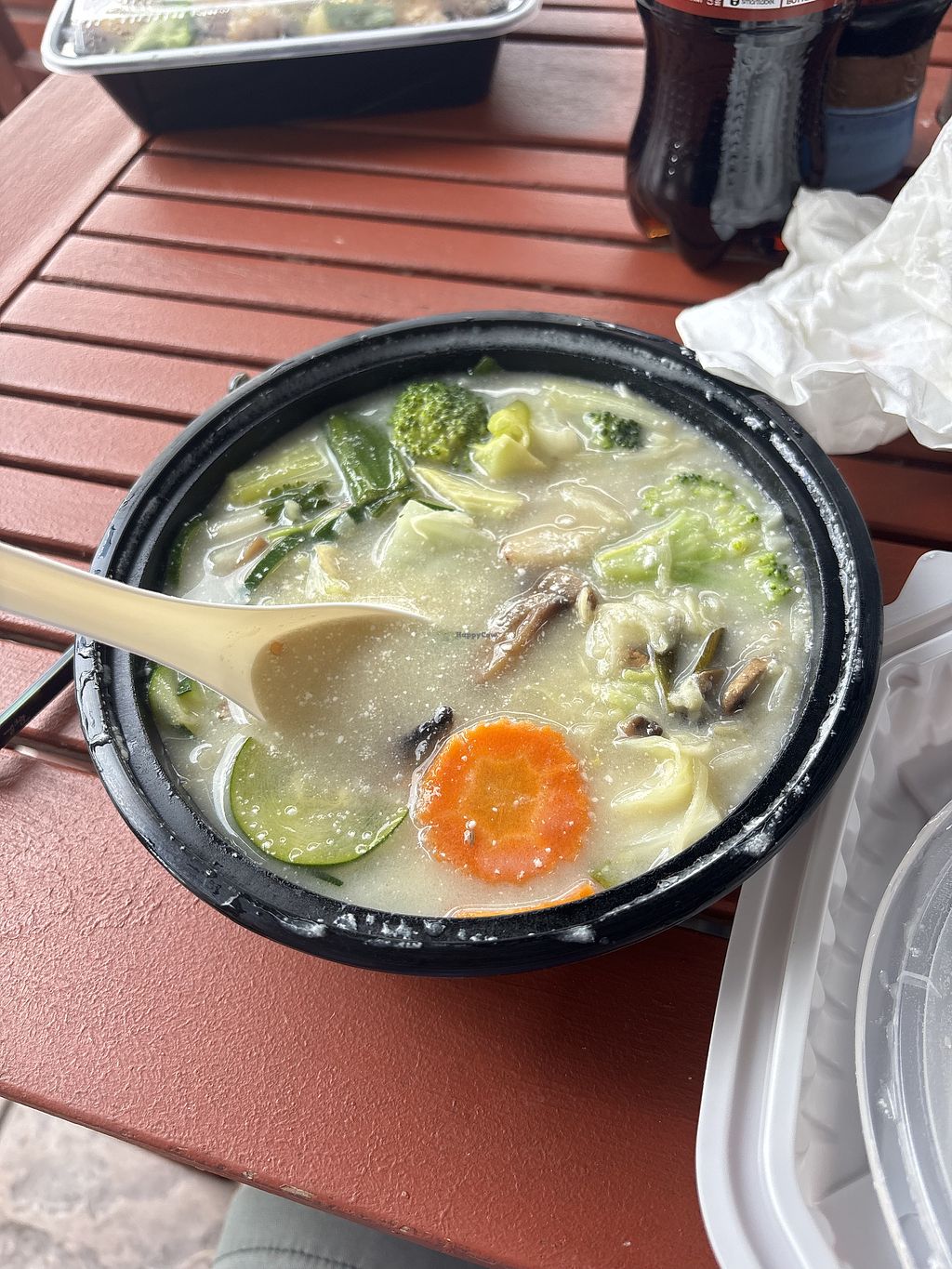Thai Kitchen is a small restaurant focused on takeout. There is a small outdoor seating area, but you order the food as takeout and it comes in containers.