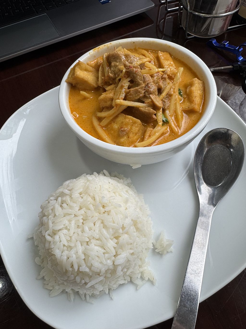 I was assured that the red curry is vegan (no fish sauce). Got it with double protein, both the tofu and the mock duck. Exactly what I needed for lunch
