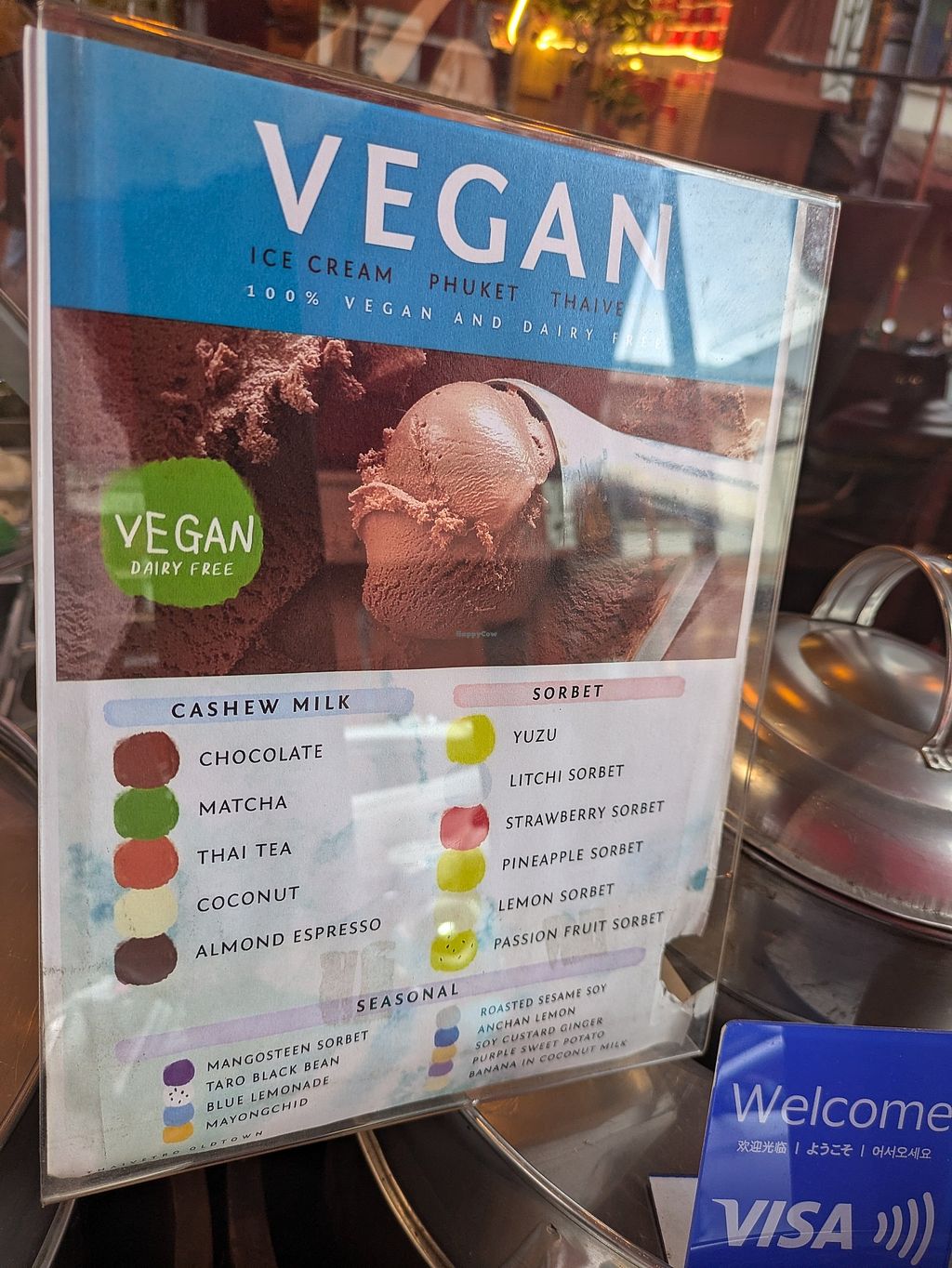 The vegan flavours are mostly sorbets , when we went there were a couple extras such as chocolate, banana and coconut or rice. Really delicious though and all vegan flavours are marked vegan which makes it easy. 79baht for one scoop in a cup.