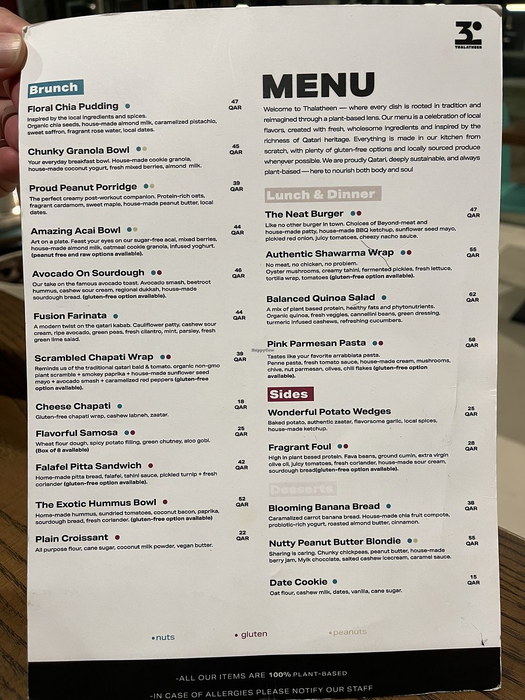 Small portion sizes and rather expensive, but we enjoyed our food and coffee! Thalatheen is in front of the National Museum of Qatar, so it is an ideal spot to have lunch after visiting in the morning, or to have breakfast before visiting. They have indoor and outdoor seating. Creative food options and nice food presentation. Good quality, but not as special as I had hoped for. They have something for everyone, e.g. a shawarma wrap, pasta, burger, salads, soups, dhal, a hummus bowl and many breakfast options.