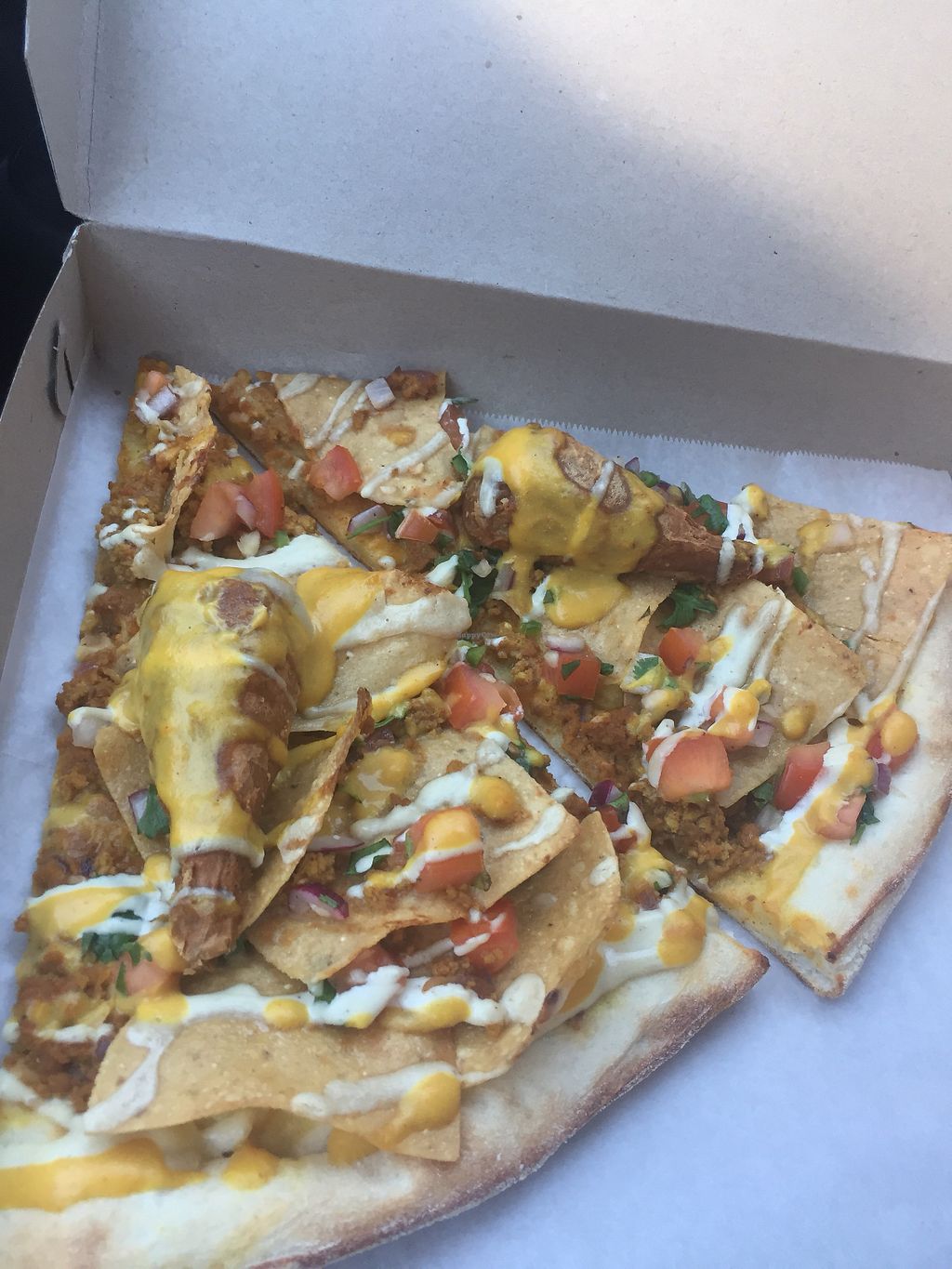 Vegan vodka slice, vegan bbq chicken slice, vegan Buffalo roll