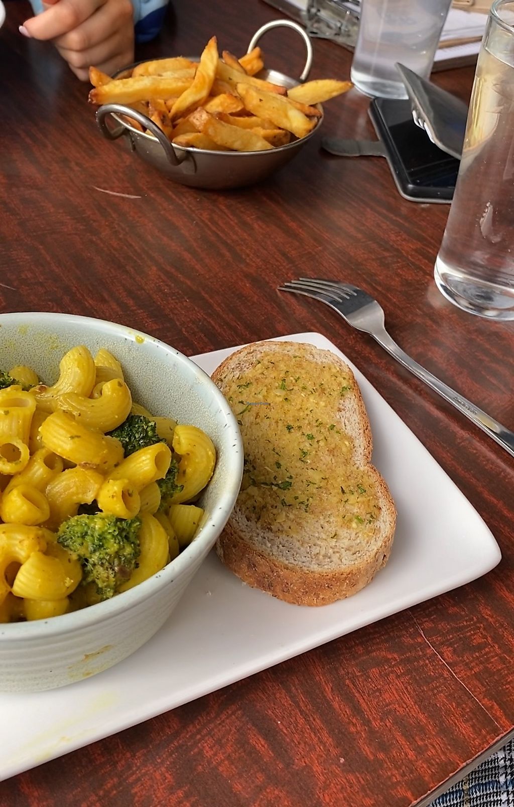 mac & cheese w/t garlic bread, and rosemary chips