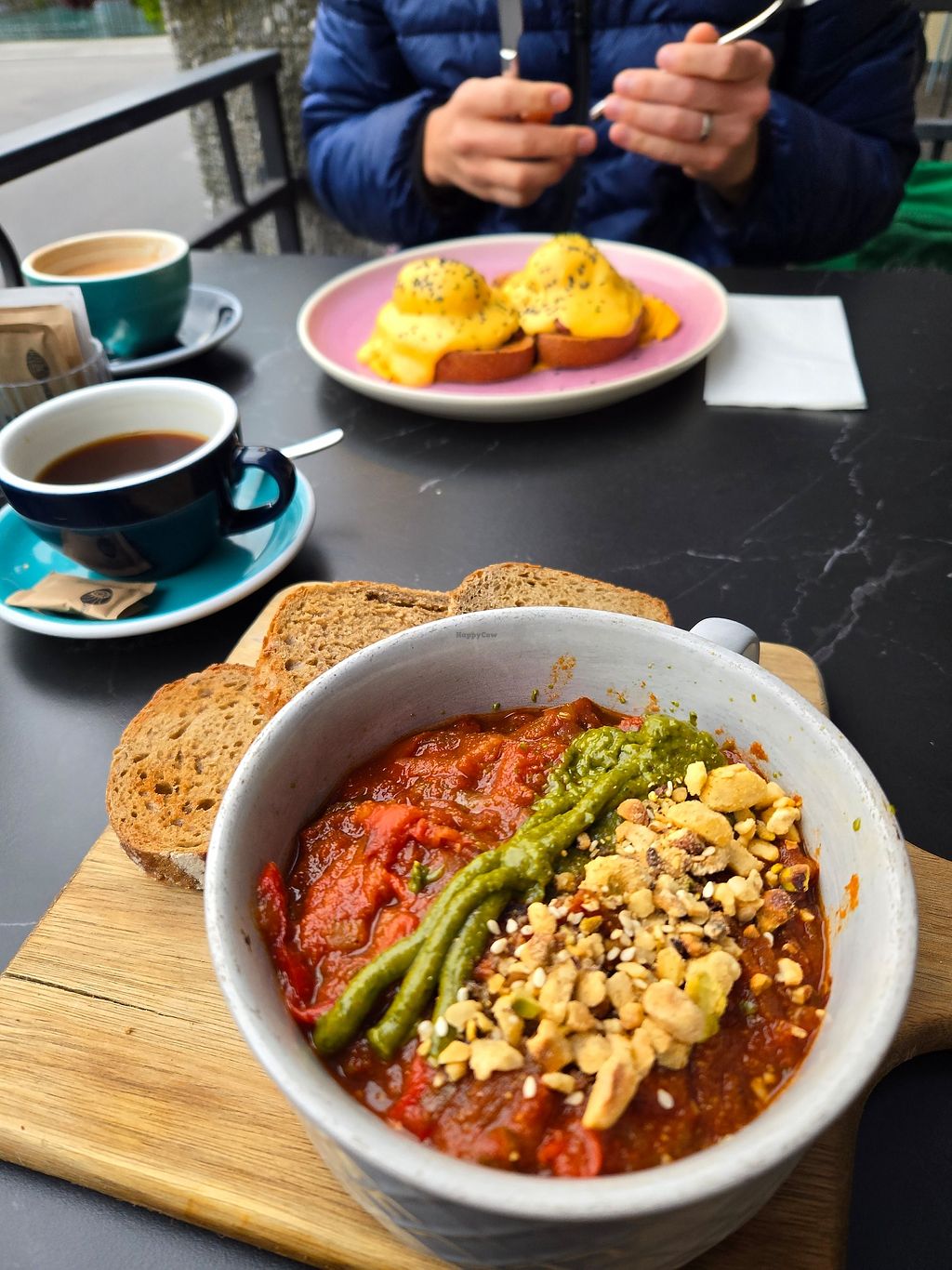 Serves meat, vegan options available. Restaurant that can make a variety of dishes vegan. Also has gluten-free options. Menu labels vegan items, such as a Buddha bowl, shakshuka with tofu, and toast. Open Mon 8:00am-7:00pm, Tue-Wed 8:00am-4:00pm, Thu-Sun 8:00am-7:00pm.