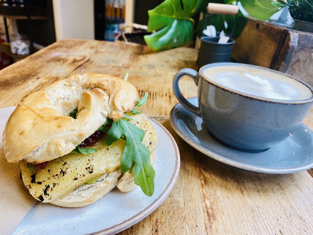 We had the ‘fun guy’ vegan version which was delicious with creamy mushrooms, rocket, vegan cheese and vegan ham in a poppy seed bagel. Would highly recommend this small but great bagel shop. They’ve got indoor and outdoor seating and nice coffee too!