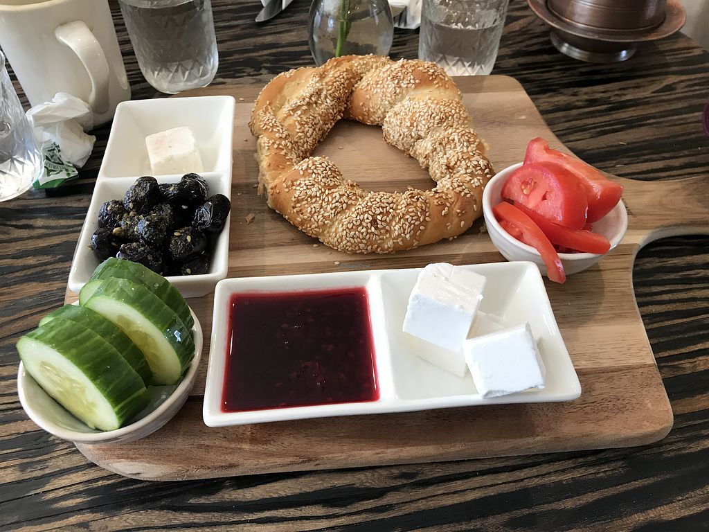 Simit with homemade vegan butter, jam, olives, and homemade vegan feta…