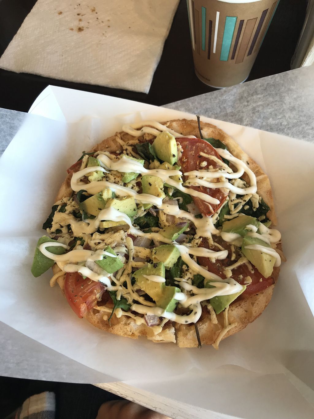 The Big V, piles of veggies, black bean hummus and avocado on a waffle…