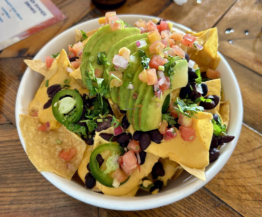 Vegan nachos with cashew cheese, black beans, jalapeños, tomatoes, oni…