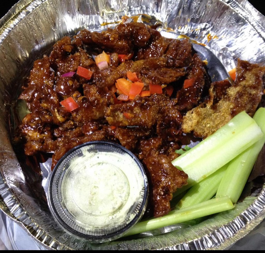 For $9.95 I got a large pan filled with vegan wings. They come in several flavors. I got 1 order of Buffalo "wings" and 1 order of General Tso. I loved both flavors, but the buffalo were, by far, my fav. I will apologize right now, because they smelled SO irresistible that I made someone else drive while I ate them in the car. So... no pictures of the yummy evidence. They were crispy and had the perfect hot/spicy, yet flavorful mix going on. For veg*ns who don't like faux meats, you'll love these too. Not "meaty" at all. I've traveled all over, and these are now my #1 favorite vegan buffalo wings of all time. Carnivores? You’ll love them too! My carnivorous family tried to eat all of mine!