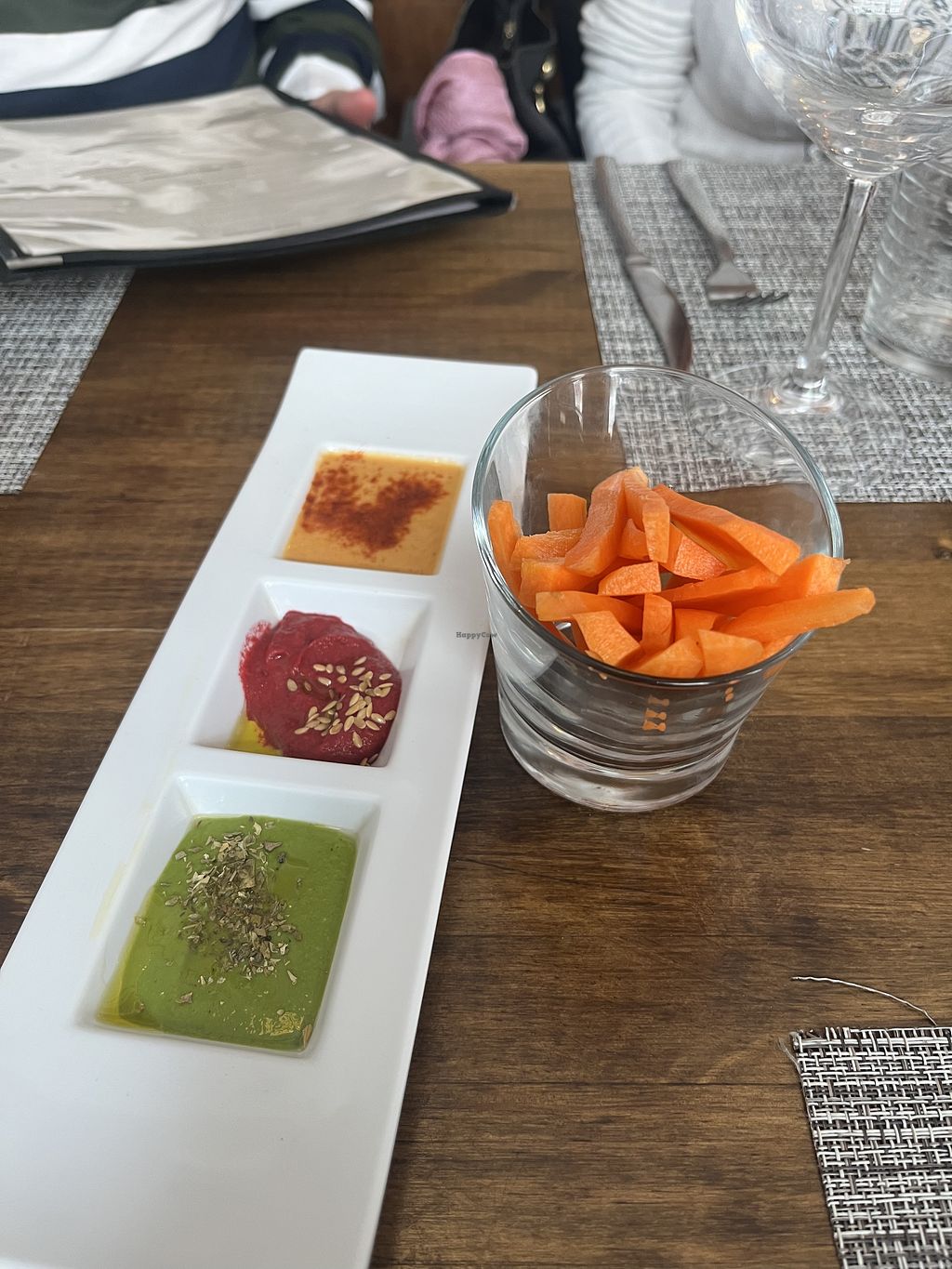 Three types of hummus - spinach, regular, and raspberry