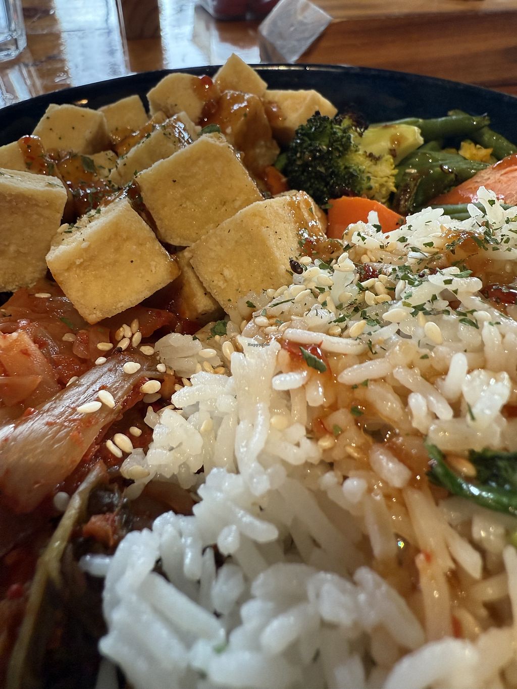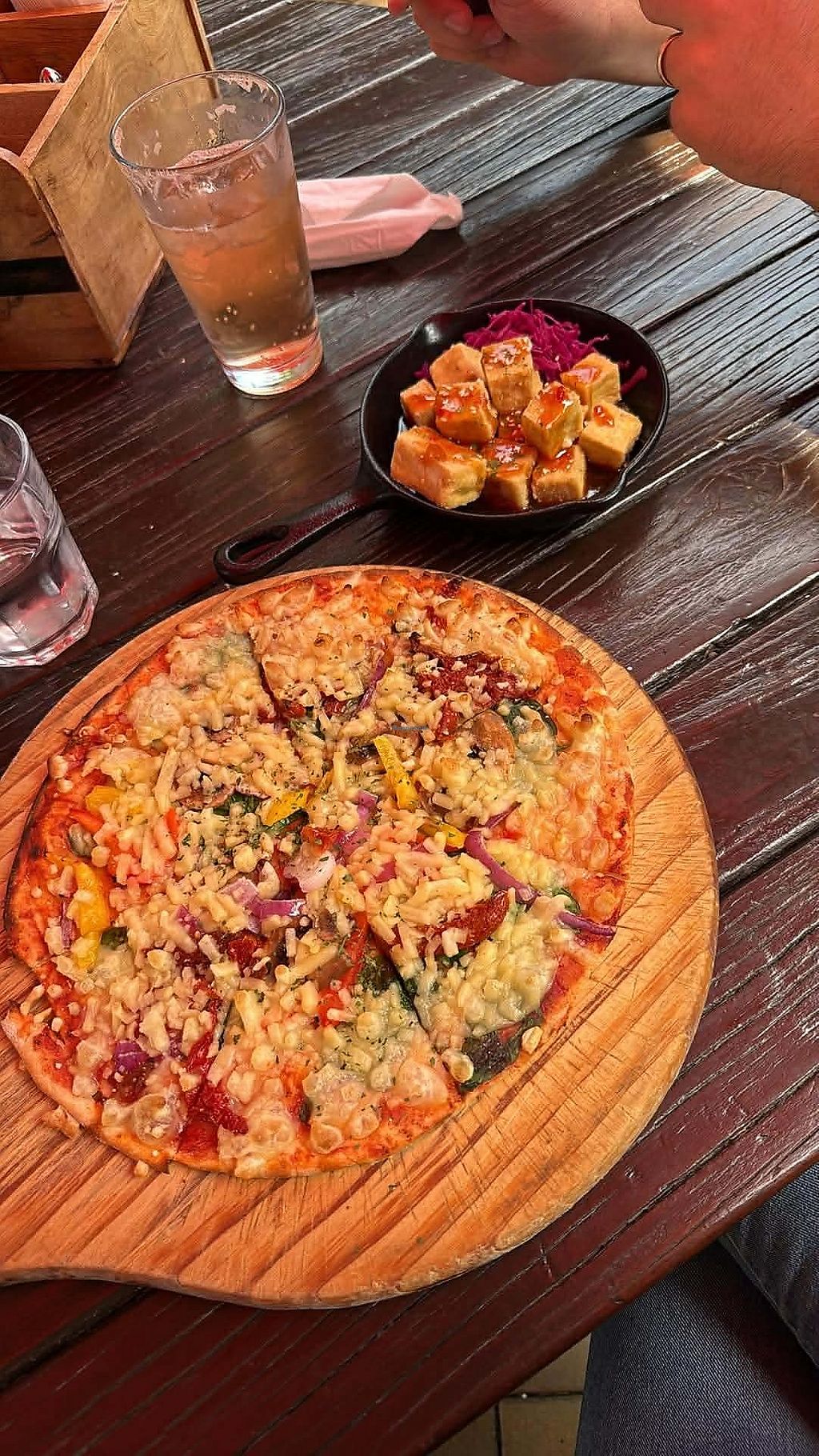 Vegetarian pizza with vegan cheese, crispy tofu entree